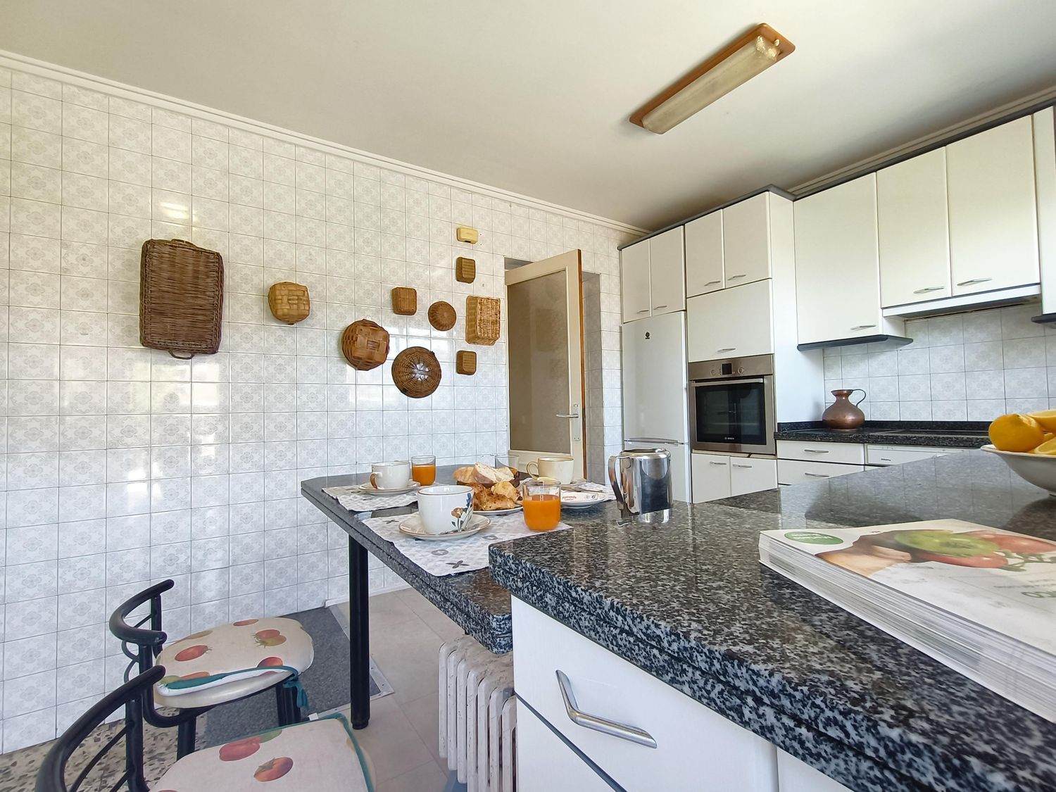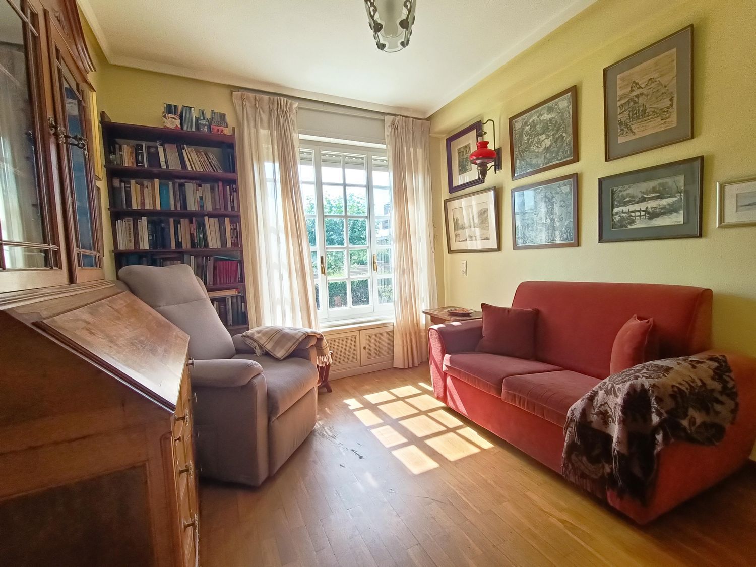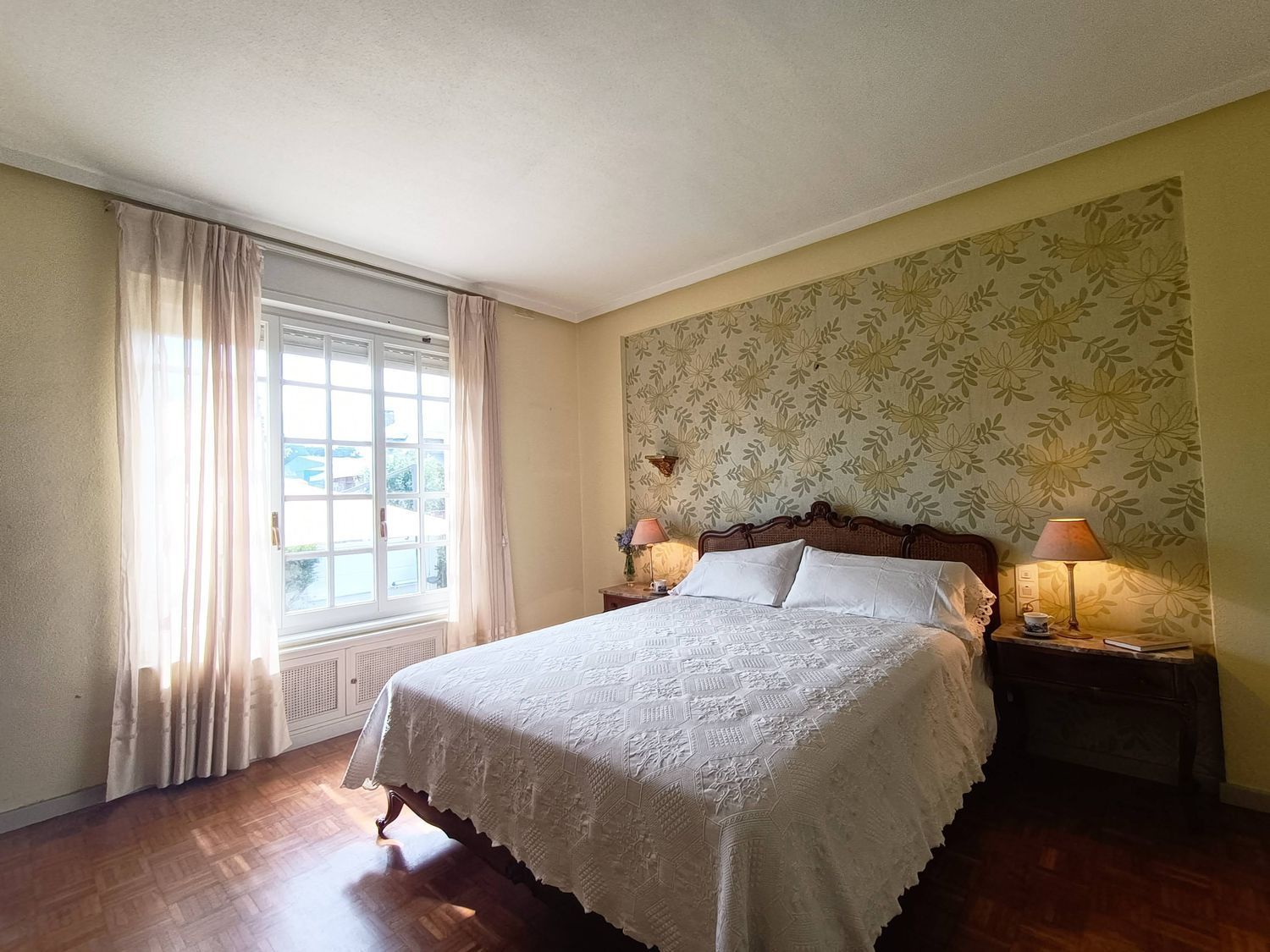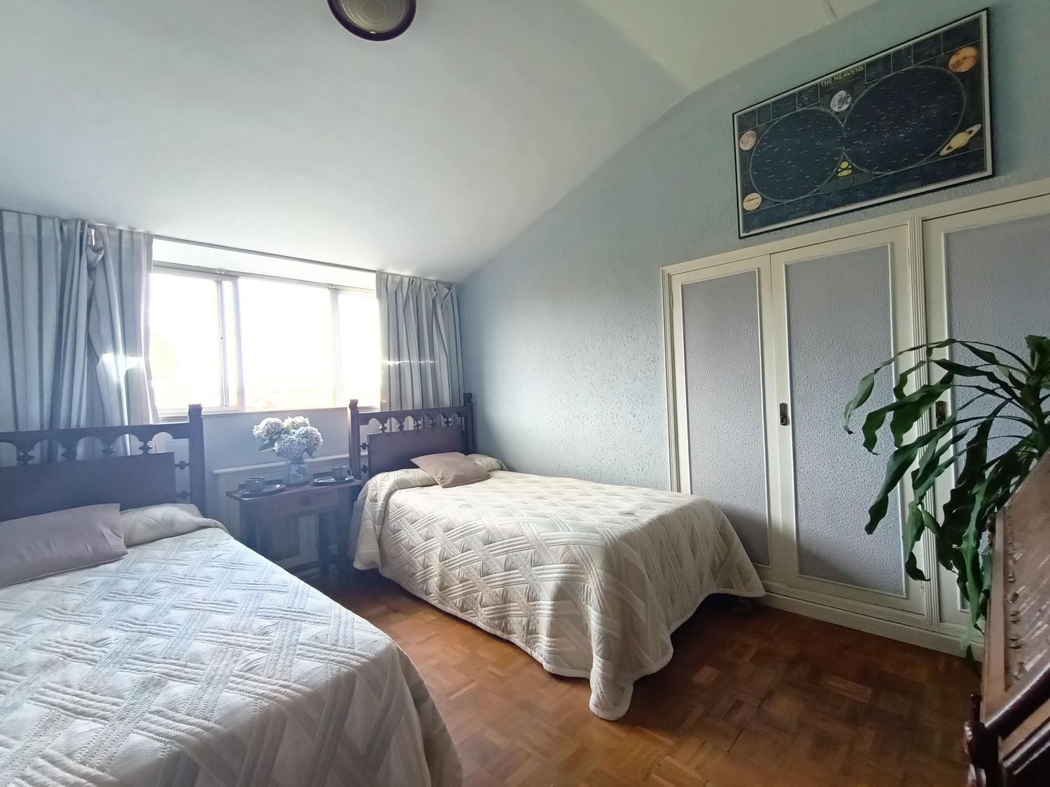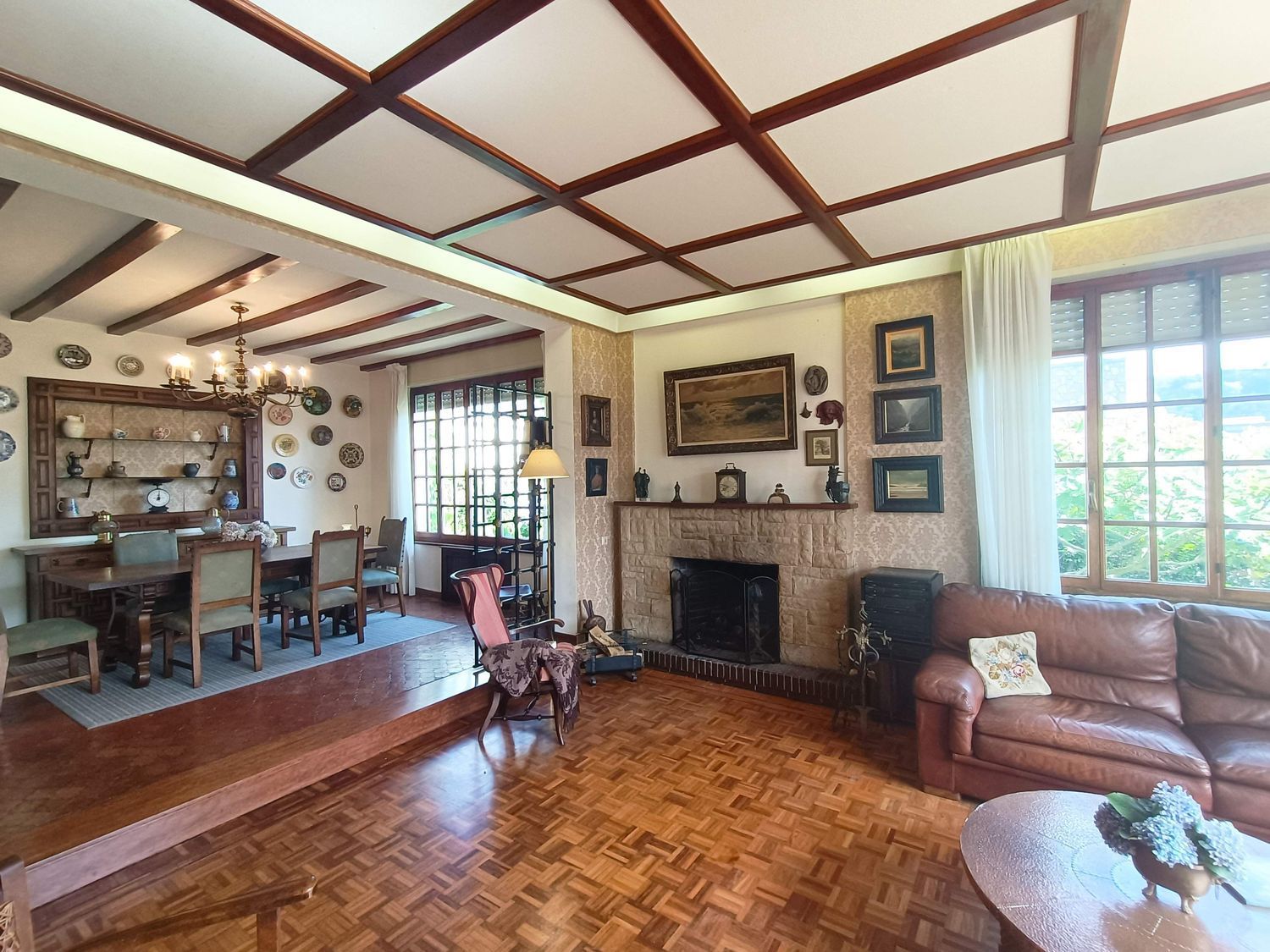 Primera planta dos dormitorios uno de ellos al día de hoy convertido en salita, cocina, salón con grandes ventanales y chimenea, dos baños y hall de entrada con escalera de caracol que nos da paso a la planta abuhardillada de arriba.