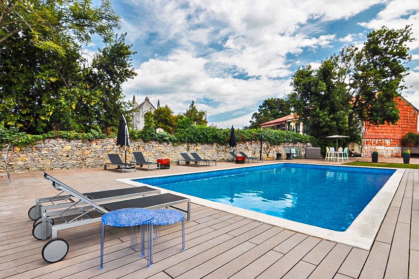 El exterior de la Villa dispone de amplia zona de piscina y barbacoa ideales para disfrutar en familia y con amigos, así como de una gran parcela con jardín consolidado. Toda la vivienda está rodeada de un importante muro de piedra que lo aísla y protege. Todo el edificio es adaptado y dispone de espacio diseñado para ubicación de ascensor desde la planta baja a todas las plantas de la vivienda.