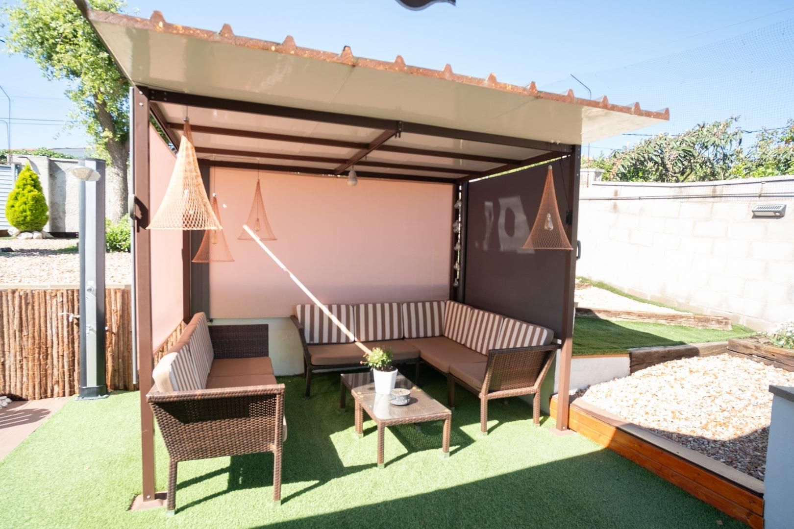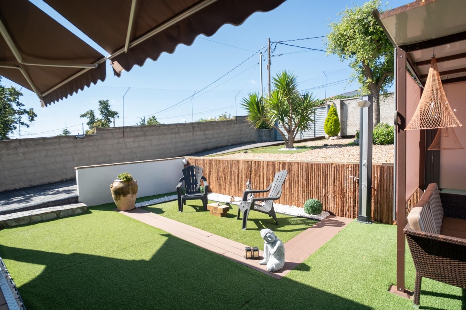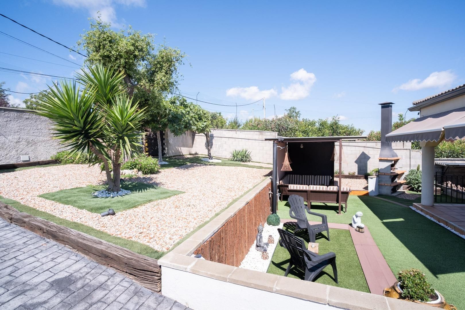 El exterior tiene suelo de hormigón impreso, zona ajardinada tipo chill-out, barbacoa, precioso porche de entrada a la casa, garaje cubierto de 56 m2, (con lavadero y almacén), porche exterior para 3 coches y zona de huerto.