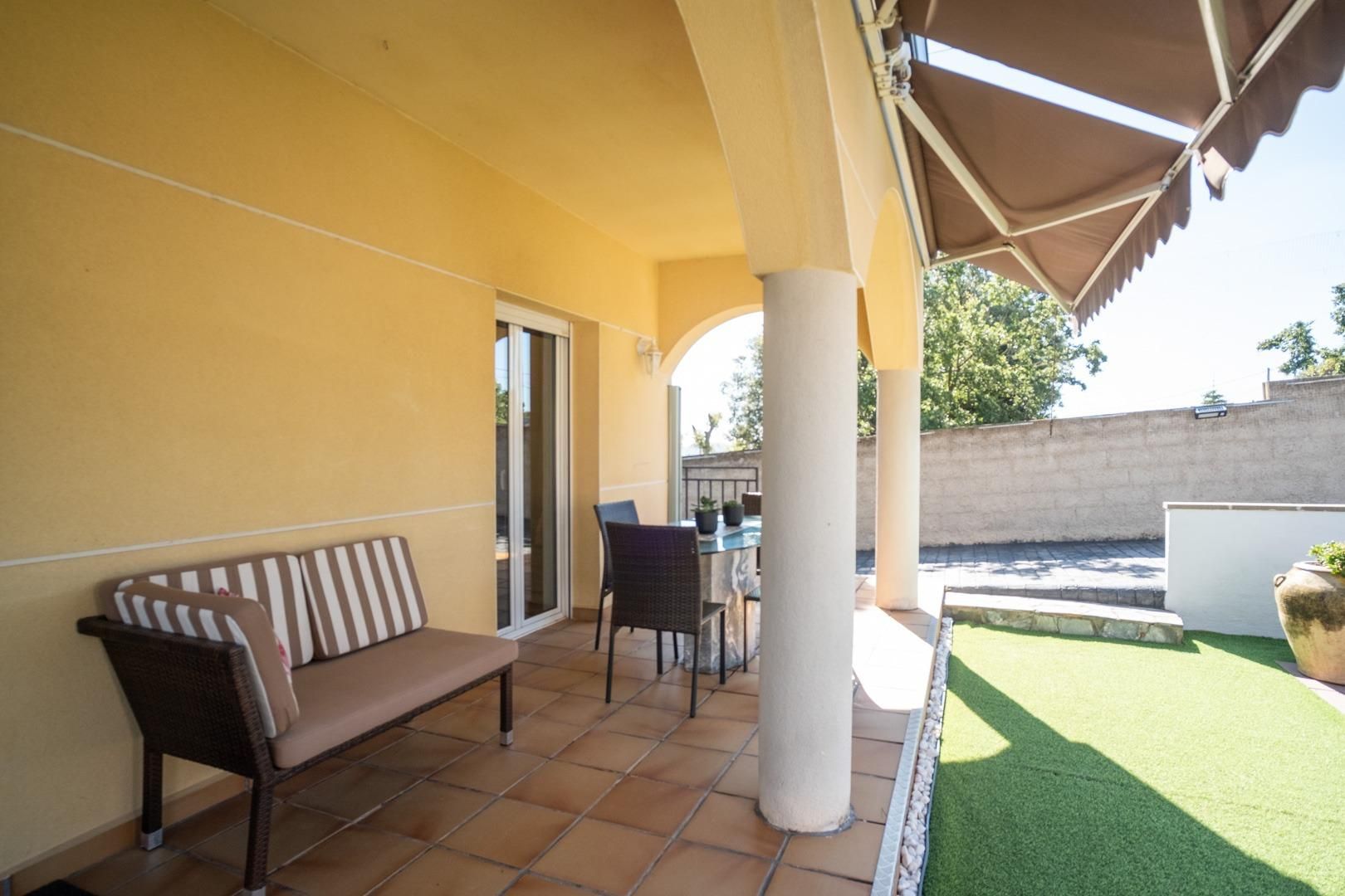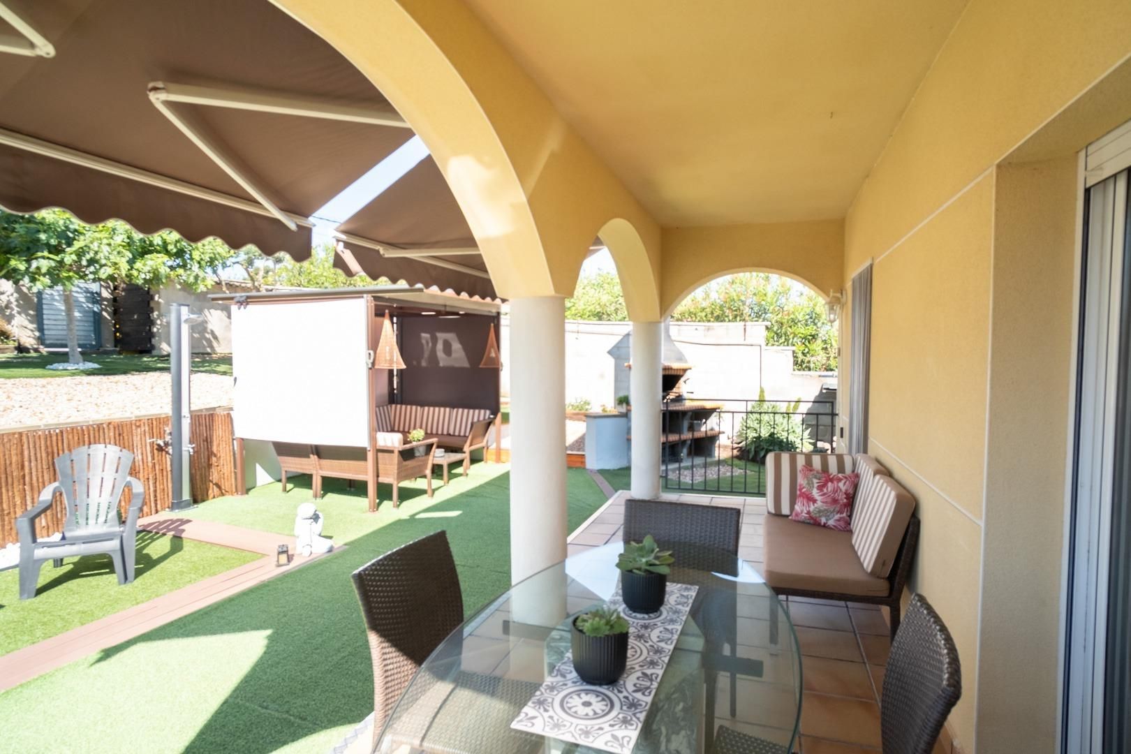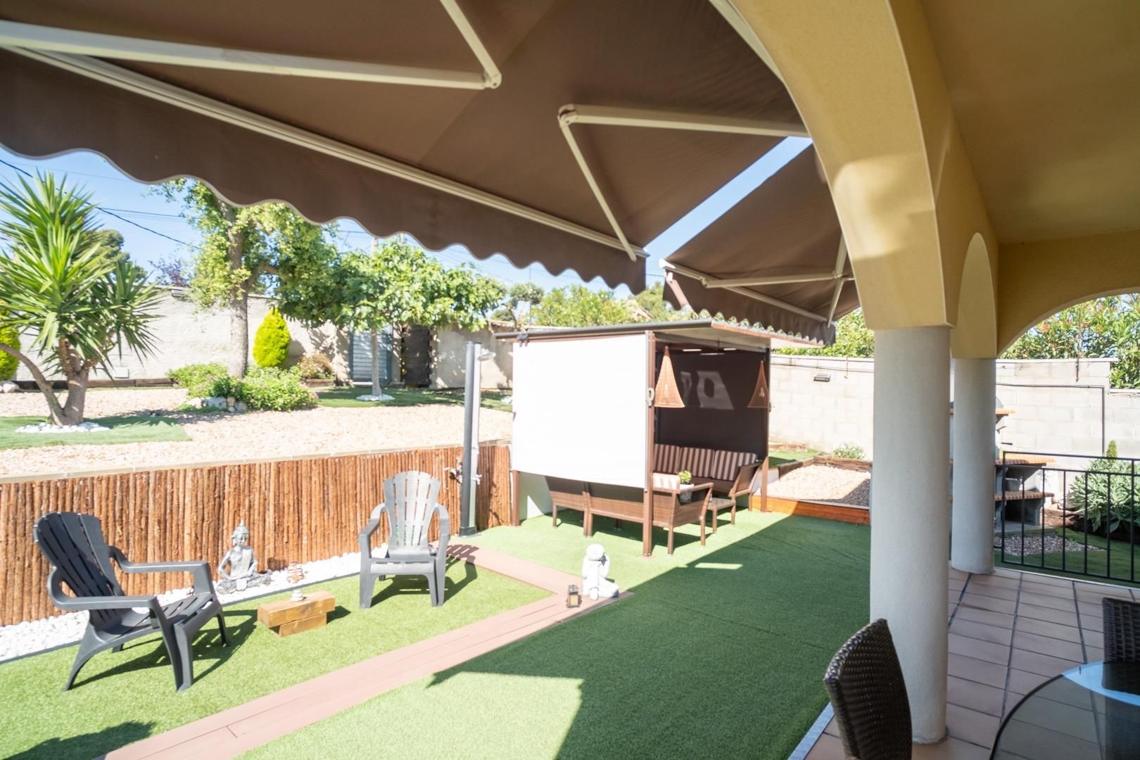 El exterior tiene suelo de hormigón impreso, zona ajardinada tipo chill-out, barbacoa, precioso porche de entrada a la casa, garaje cubierto de 56 m2, (con lavadero y almacén), porche exterior para 3 coches y zona de huerto.