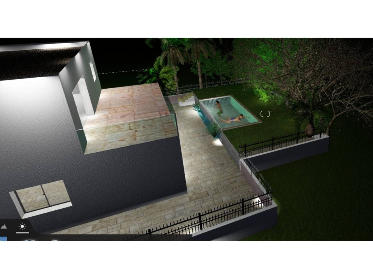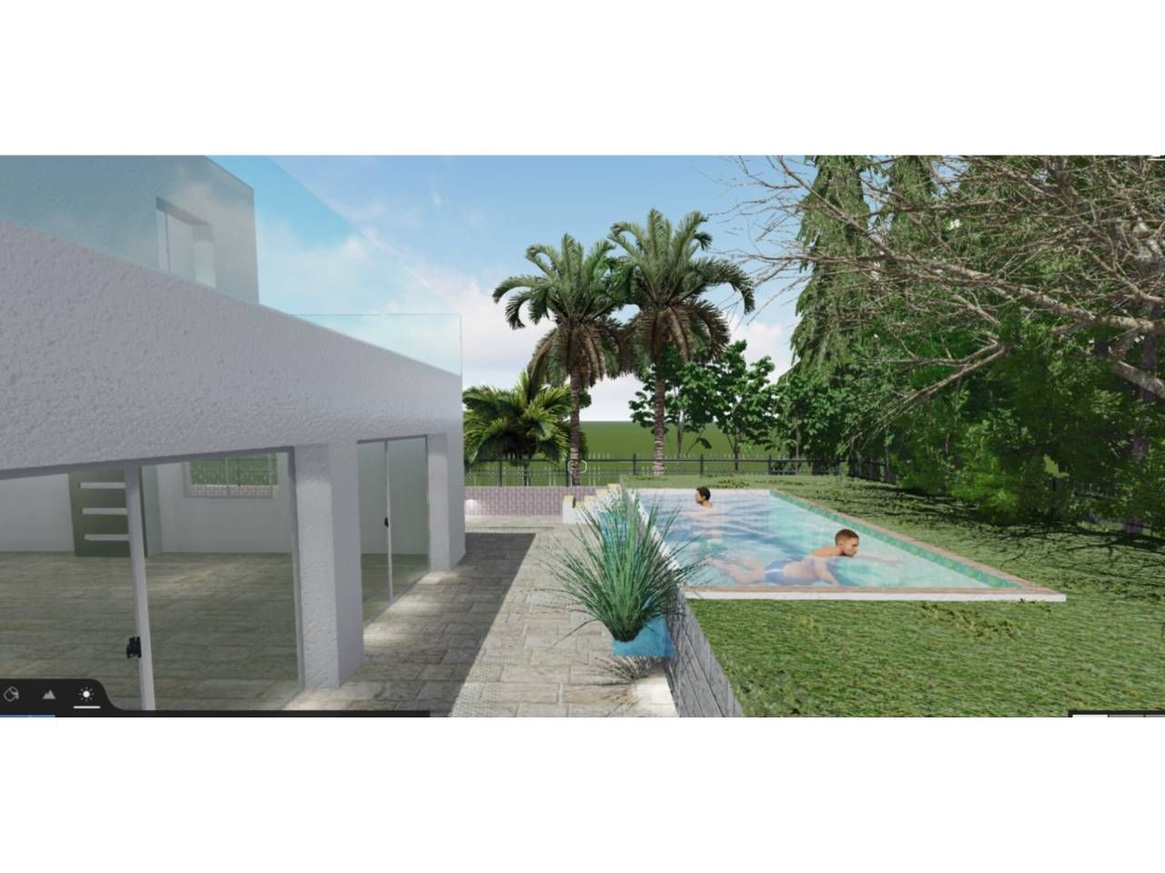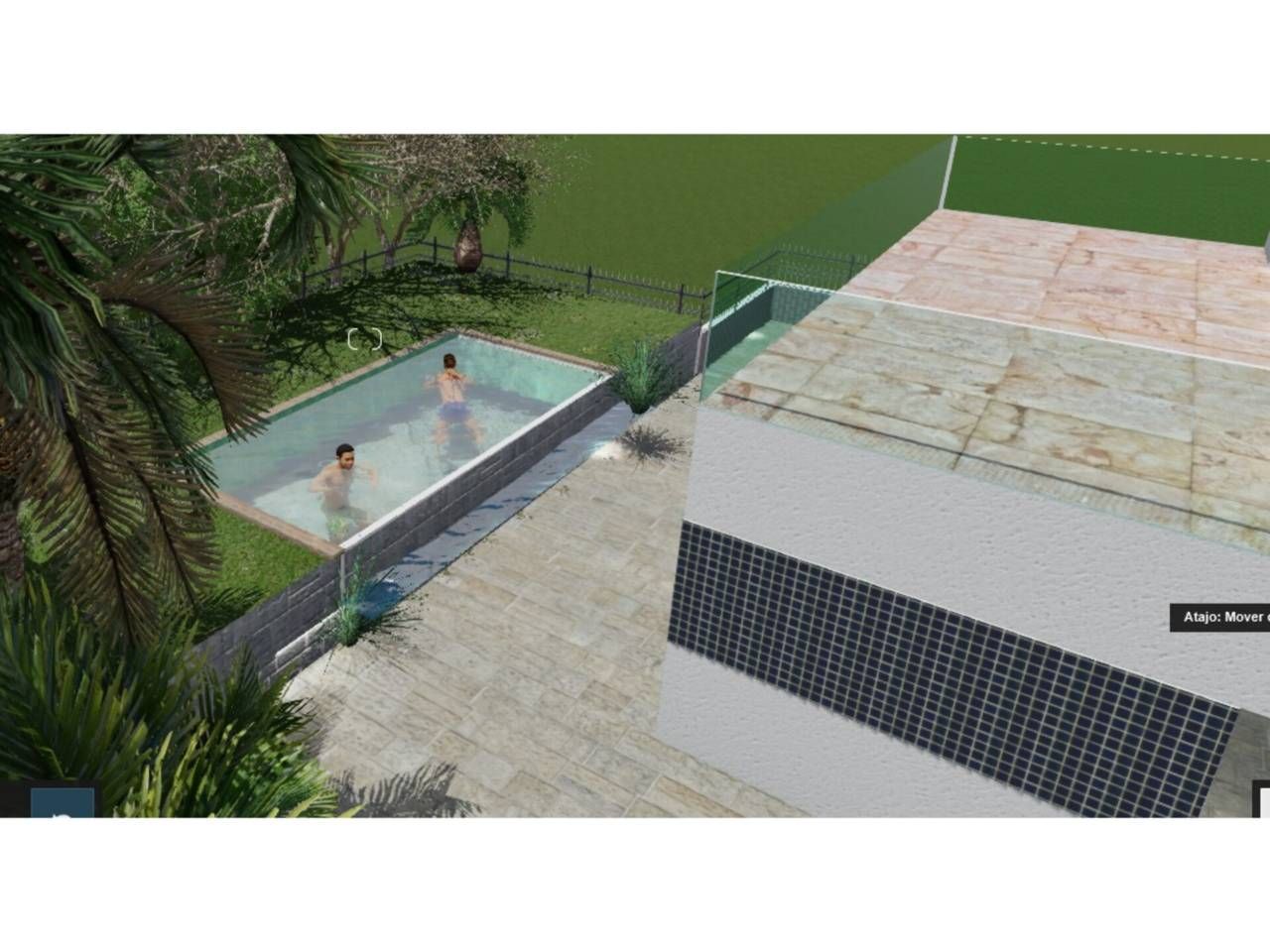 A los laterales de la casa hay dos caminos, uno en cada lado, que permiten acceder a la piscina. El camino del lado izquierdo es mucho más amplio, pensado para poder aparcar el coche y descargar las compras, ya que cuenta con una puerta de acceso por ese lateral.