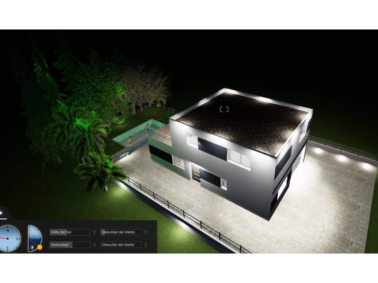 En la fachada blanca de la casa encontramos el garaje con puerta automática. Al entrar en el garaje, a mano izquierda se encuentra la puerta que conecta con el interior de la casa. Al entrar por esta puerta, nos encontramos con un pasillo que conduce a la primera habitación de matrimonio, la cual cuenta con un amplio ventanal que proporciona una excelente iluminación natural.