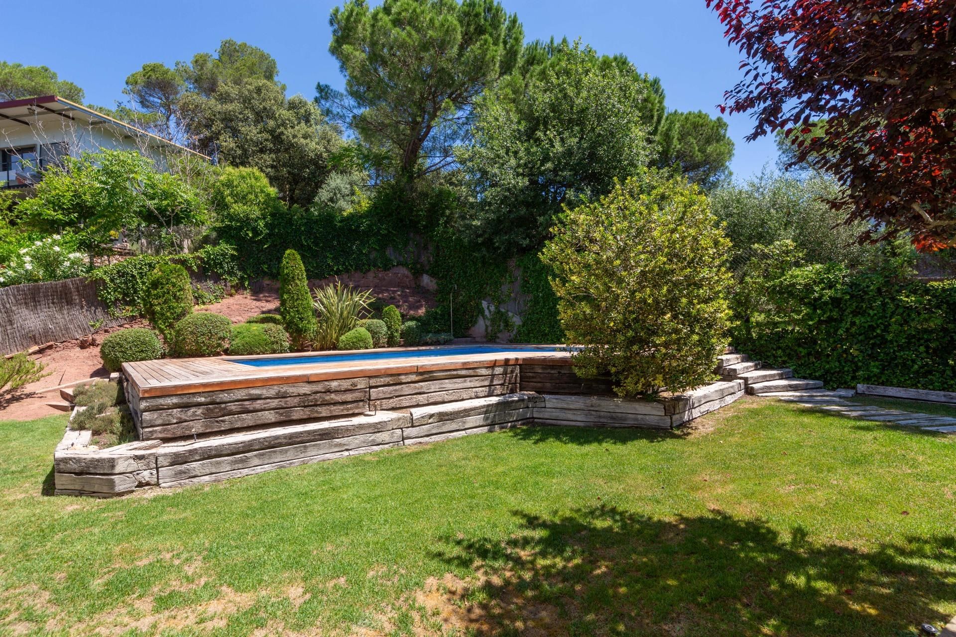 Piscina elevada amb travesses de 7 x 4 al jardí de gespa natural amb reg automàtic.