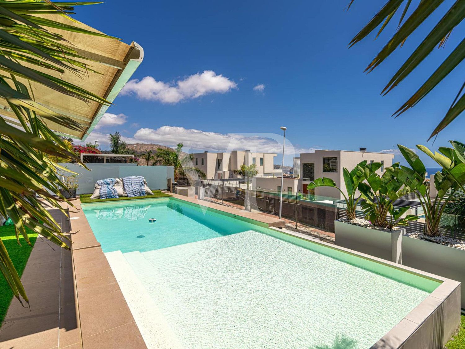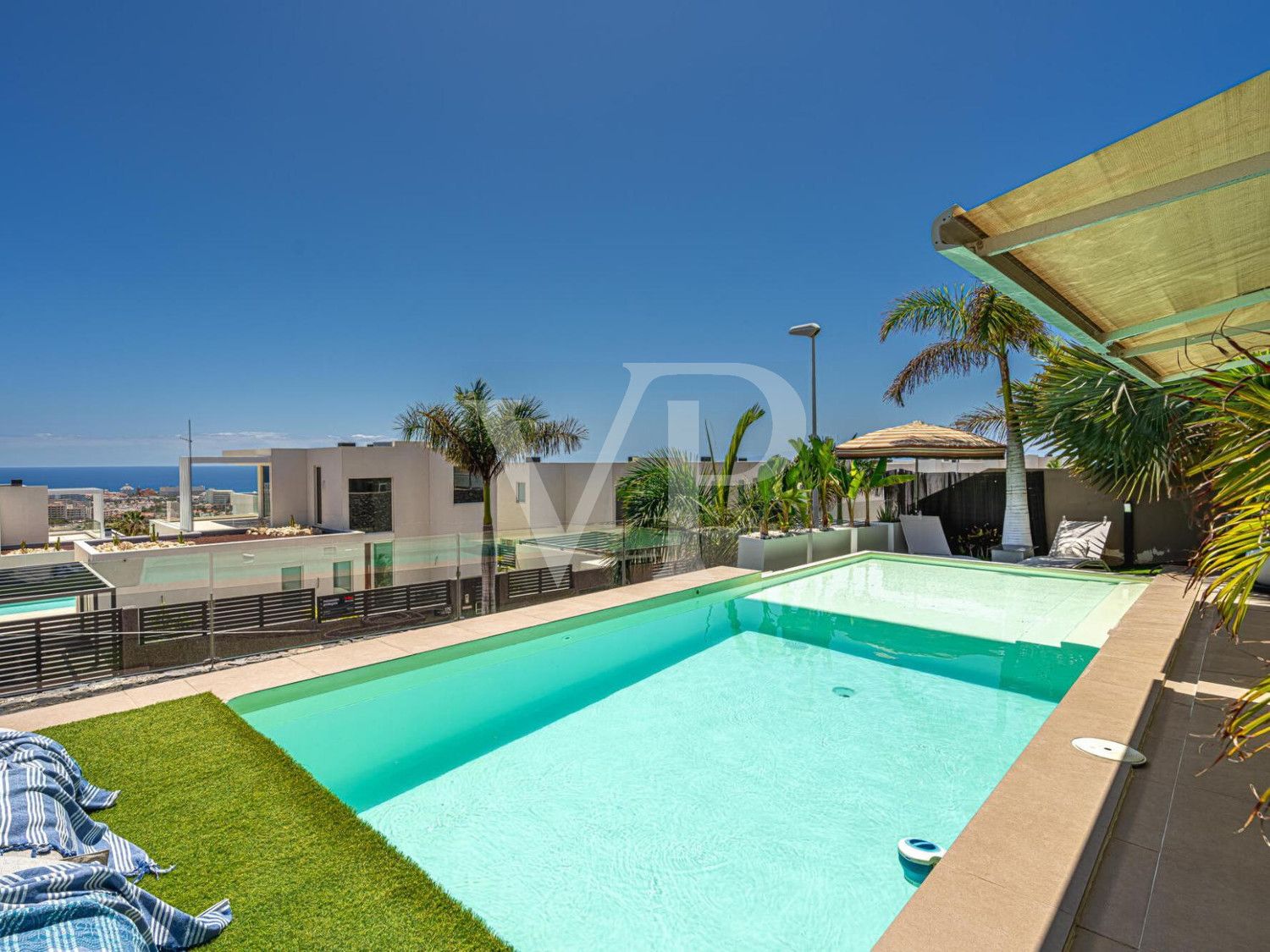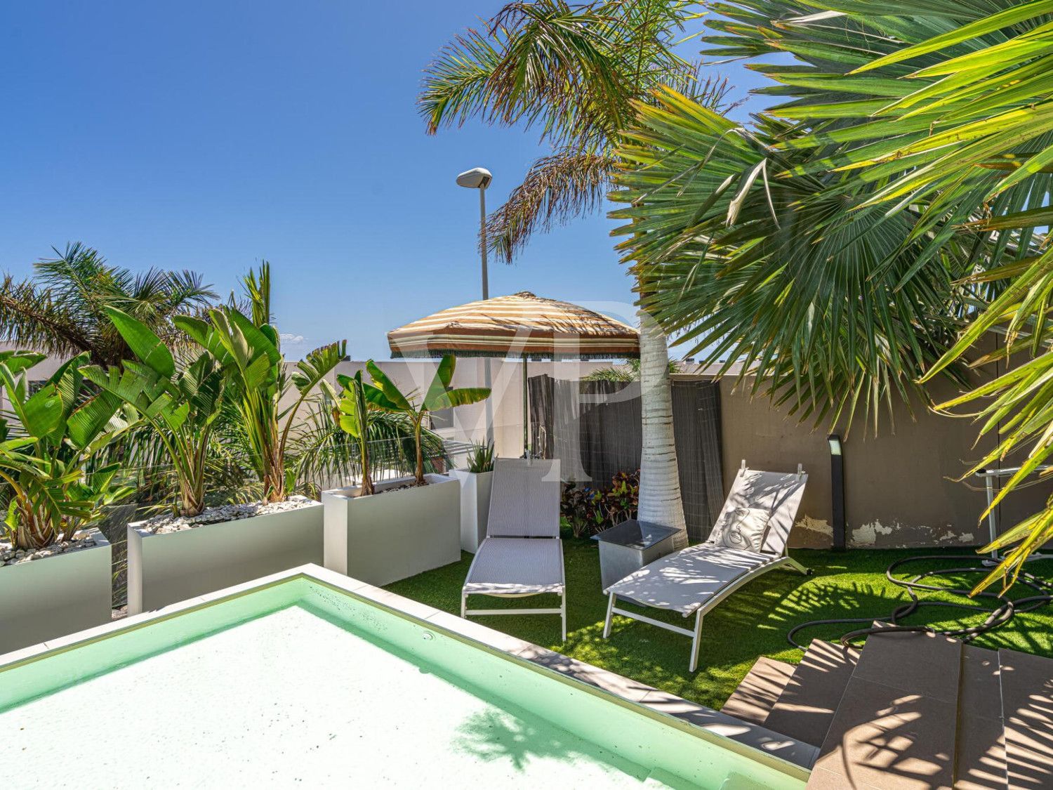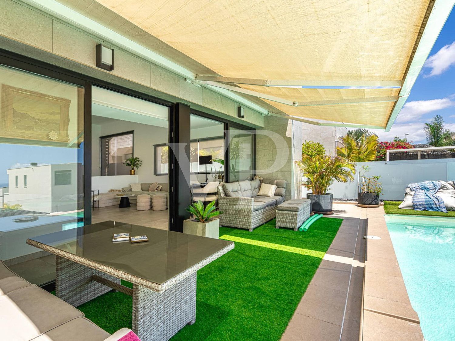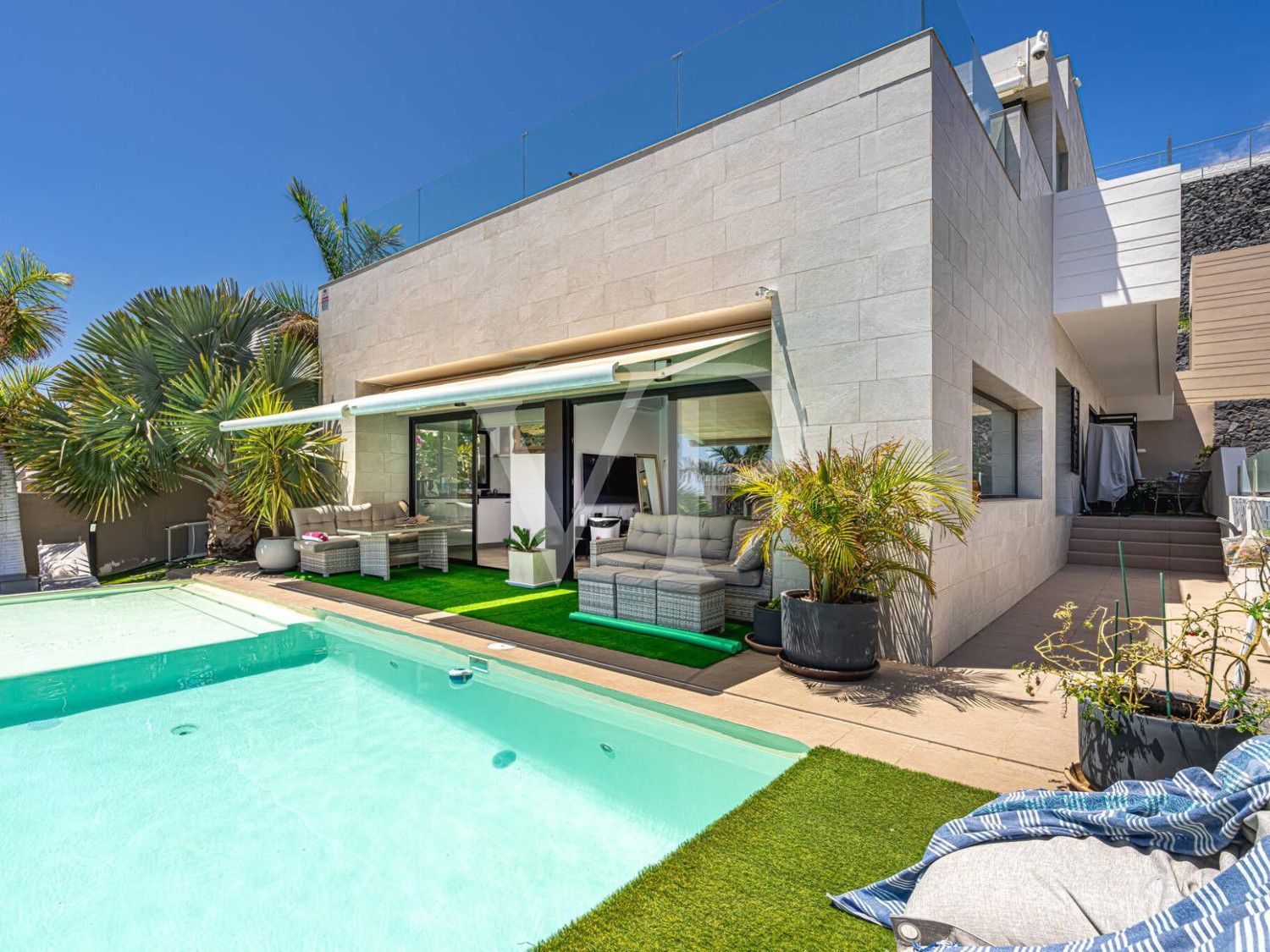 Esta moderna y encantadora propiedad se encuentra situada en Caldera del Rey, uno de los sitios más requeridos en el sur de la isla. La propiedad está distribuida en dos plantas, con una distribución abierta y luminosa. Ofrece un total de cuatro dormitorios, tres baños, un bonito jardín, una piscina recientemente renovada y vistas al mar. La planta baja de la propiedad ofrece un recibidor, un amplio dormitorio con baño en suite y vestidor. Subiendo a la planta principal encontramos tres dormitorios en total, uno de ellos con salida al exterior, un total de dos baños, uno compartido con las habitaciones de huéspedes y otro en suite. En la misma planta encontramos un gran y luminoso salón comedor con ventanas correderas, las cuales permiten tener unas bonitas vistas al exterior. Una cocina totalmente equipada y semi abierta, ideal para los amantes de la cultura culinaria. En la zona exterior encontramos una terraza acogedora, con espacio para disfrutar de almuerzos o cenas en familia o con amigos. Un bonito jardín con plantas y palmeras que da vida a la casa y una piscina infinita, ideal para disfrutar del excelente clima que ofrece Tenerife. - Casa adosasda - 4 dormitorios / 3 baños - Aire acondicionado caliente / frio - Cocina completamente equipada - Jardín privado con palmeras - Piscina climatizada renovada - Vistas al mar - Se vende amueblada Caldera del Rey es una exclusiva región residencial en Tenerife, conocida por su impresionante paisaje y clima agradable. La región se encuentra por encima de Playa de Las Américas, ofreciendo una gran vista al mar desde casi cualquier ubicación. Situada cerca del popular complejo turístico de Costa Adeje, Caldera del Rey combina la belleza natural con el confort moderno. En Caldera del Rey se encuentran lujosos resorts, tiendas exclusivas y restaurantes de primera categoría que ofrecen a los visitantes un alto nivel de comodidad y entretenimiento. Las playas de la zona son perfectas para relajarse y tomar el sol, con aguas cristalinas ideales para nadar. El famoso parque acuático Siam Park también está ubicado en esta región. Con su combinación única de naturaleza, cultura y relax, Caldera del Rey es un destino muy codiciado en Tenerife. El Aeropuerto Tenerife Sur está a solo 15 minutos en coche, lo que convierte a Caldera del Rey en una ubicación extremadamente conveniente y atractiva. RESPONSABILIDAD: Comunicamos que las informaciónes sobre la propiedad y documentos que transmitimos, provienen del vendedor o propietario. No nos hacemos responsables de la exactitud o integridad de la información en general. Todas las ofertas inmobiliarias son sin compromiso y sujetas a posibles errores publicitarios. NUESTRO SERVICIO PARA USTED COMO PROPIETARIO: Si planea vender su propiedad, es importante que conozca su valor de mercado. Permita que uno de nuestros especialistas inmobiliarios evalúe profesionalmente el valor actual de su propiedad de forma gratuita y sin compromiso. Nuestra red internacional nos permite acercar a vendedores o propietarios y clientes interesados de la mejor manera posible.