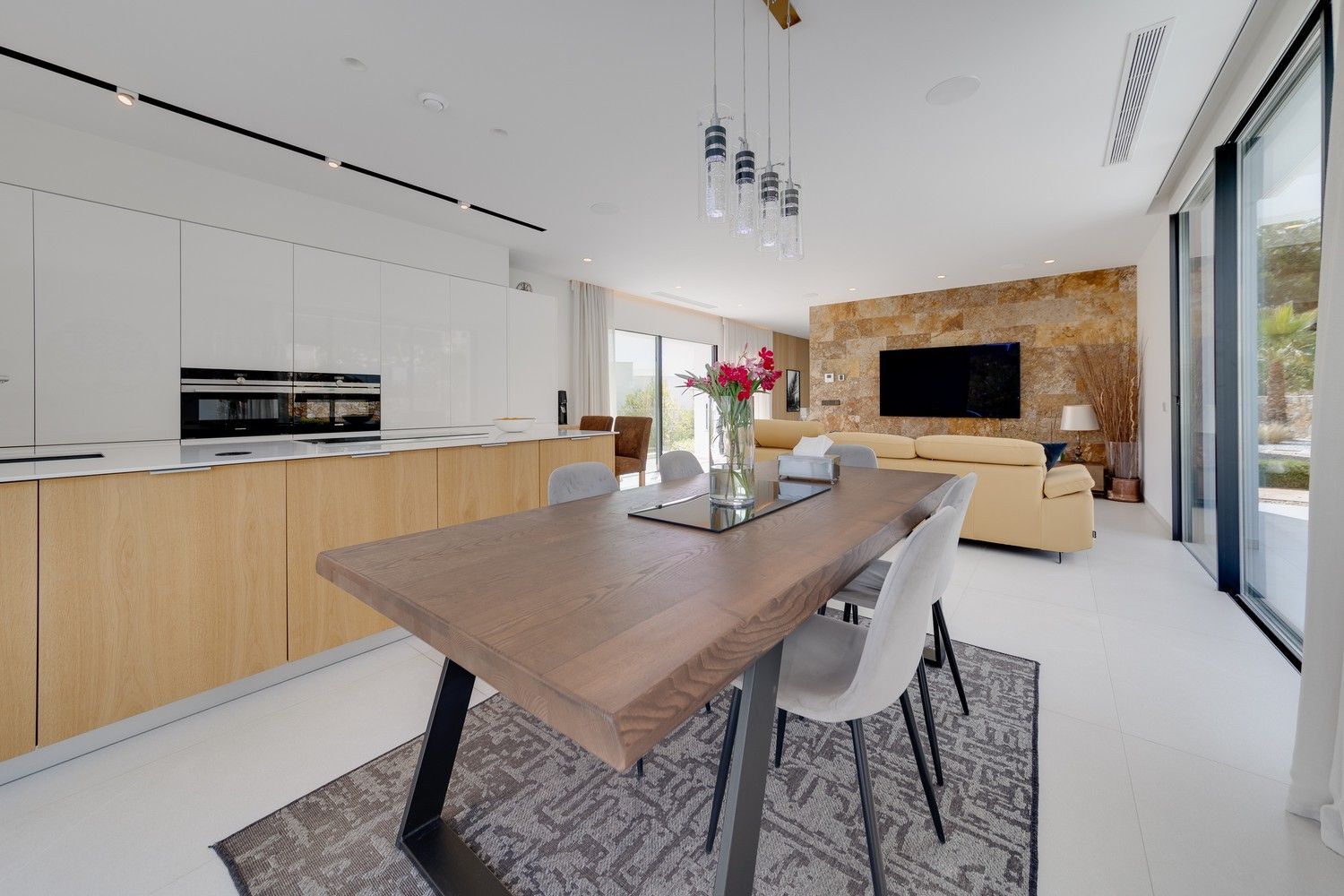 Este magnífico chalet construido en 2020, se ubica sobre una parcela de aprox. 1.700 m2 y tiene una superficie aproximada de unos 240 m2. La vivienda, dividida en dos niveles, consta de 4 dormitorios dobles con armarios empotrados, tres de ellos en la planta superior y otro en el nivel inferior. Cuatro cuartos de baño, tres de ellos en suite. Además, en el nivel superior se puede disfrutar de un gran salón-comedor con cocina americana completamente equipada y con electrodomésticos. La vivienda dispone de garaje para dos vehículos en el nivel inferior, además de un cuarto de usos para lavadora, secadora, caldera, osmosis, etc. En el exterior de la parcela se encuentra la gran piscina de 27 m2 de lámina de agua, terraza de unos 71 m2, una estupenda sauna, jacuzzi con excepcionales vistas al bosque, zona de barbacoa y cocina exterior, zona de barbacoa nocturna y jardines con paisajismo de fácil mantenimiento. Por su ubicación, se trata de una propiedad con gran privacidad y en un entorno inigualable como es el de las Colinas. Una gran elección que combina lujo y exclusividad con los últimos adelantos en tecnología para el mantenimiento de calefacción por suelo radiante en la planta principal, servicio de agua caliente y aire acondicionado, siendo todos ellos suministrados por energías ecológicas. Otros extras incluidos en la propiedad son, cortinas y persianas automatizadas, sistema de audio por altavoces integrados en el techo en todas las estancias, paneles solares en la azotea de la casa, muebles, etc.