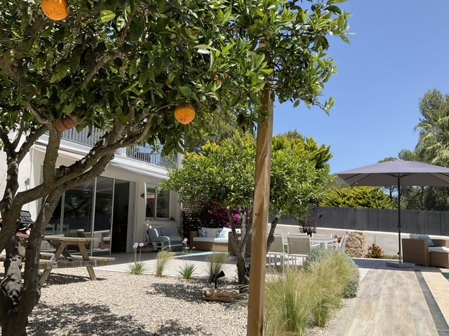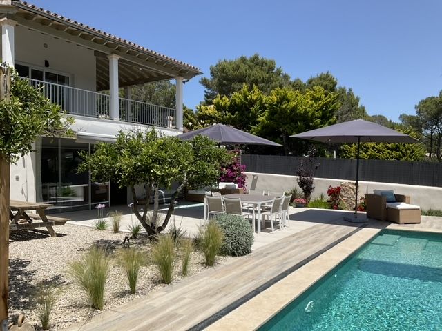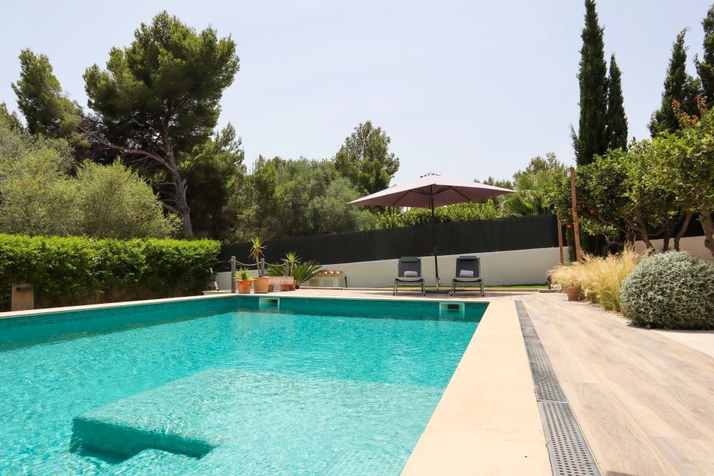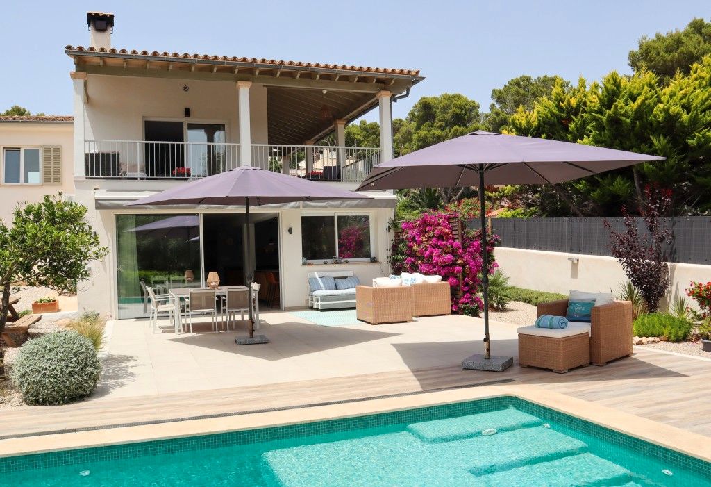 Welcome to this stunning 4-bedroom villa, a perfect blend of modern luxury and serene living. This beautifully reformed property, completed in 2024, has been designed to provide the ultimate in comfort and style. Located in the residential area of Santa Ponsa, this property is a short walk away from the beautiful Marina. Meticulously reformed to offer beautiful landscaped Gardens around the property, featuring Orange Trees, Apricot Trees, and Yellow Plum Trees to the rear and Olive trees to the front of the property. The pristine saltwater swimming pool, surrounded by non-slip ceramic tiles, provides a safe and inviting space to relax and enjoy the warm summer months. The villa's outdoor areas are perfect for entertaining, with a covered terrace upstairs accessible from the master bedroom, and a lower terrace shaded by toldos. Privacy is paramount, as the wrap-around garden ensures you are not overlooked by neighbours, while offering delightful views of the green zone. The villa's direct SOUTH orientation bathes the property in natural light throughout the day. The property comprises of a large entrance hallway with a WC, built in custom under-stairs storage offers practical solutions for shoes, coats, and bags, while a store room at the front of the house can accommodate motorcycles, mountain bikes, and more.. Stepping into the large open plan living, dining and kitchen area, each space has carefully designed to make the most out of the space. The Valdesign kitchen features fully integrated Neff appliances, including a full-length fridge and freezer. The lounge area featuring a wood burner and sliding climate-adjusting doors that open to the terrace, seamlessly blending indoor and outdoor living. With matching ceramic tiles inside and non-slip tiles outside on the terrace. Equipped with city gas central heating and hot and cold air conditioning units, ensuring comfort in every season. A secret door from the lounge leads to an open room that could be used as a gym or games room, providing versatile additional space. All four bedrooms are on the upper level of the villa, accessible from the large bright hall way. There would be room for an additional fifth bedroom in this space. Each of the four bedrooms is spacious enough for a double bed and comes with fitted wardrobes and ceiling fans. While three of the bedrooms share two generous bathrooms, the Master suite has a walk through Alf dafre closet into its own en-suite complete with rain shower and his and hers Mapini sinks. Facing south of the property the Master Suite overlooks the beautiful gardens and the green zone, with sliding doors that lead onto a rear and side terrace, this would make a great place to relax and enjoy the tranquil location. There is a laundry room on with ample storage space and direct access to the garden via steps. This villa has been reformed to offer space for each member of the family whilst still offering cosy areas to spend time together as a family.