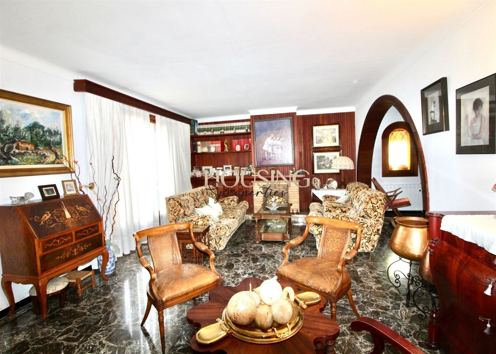 - Spacious living room, with fireplace, and access to the outside. The dining area opens to the living room through an arch, delimiting both areas.