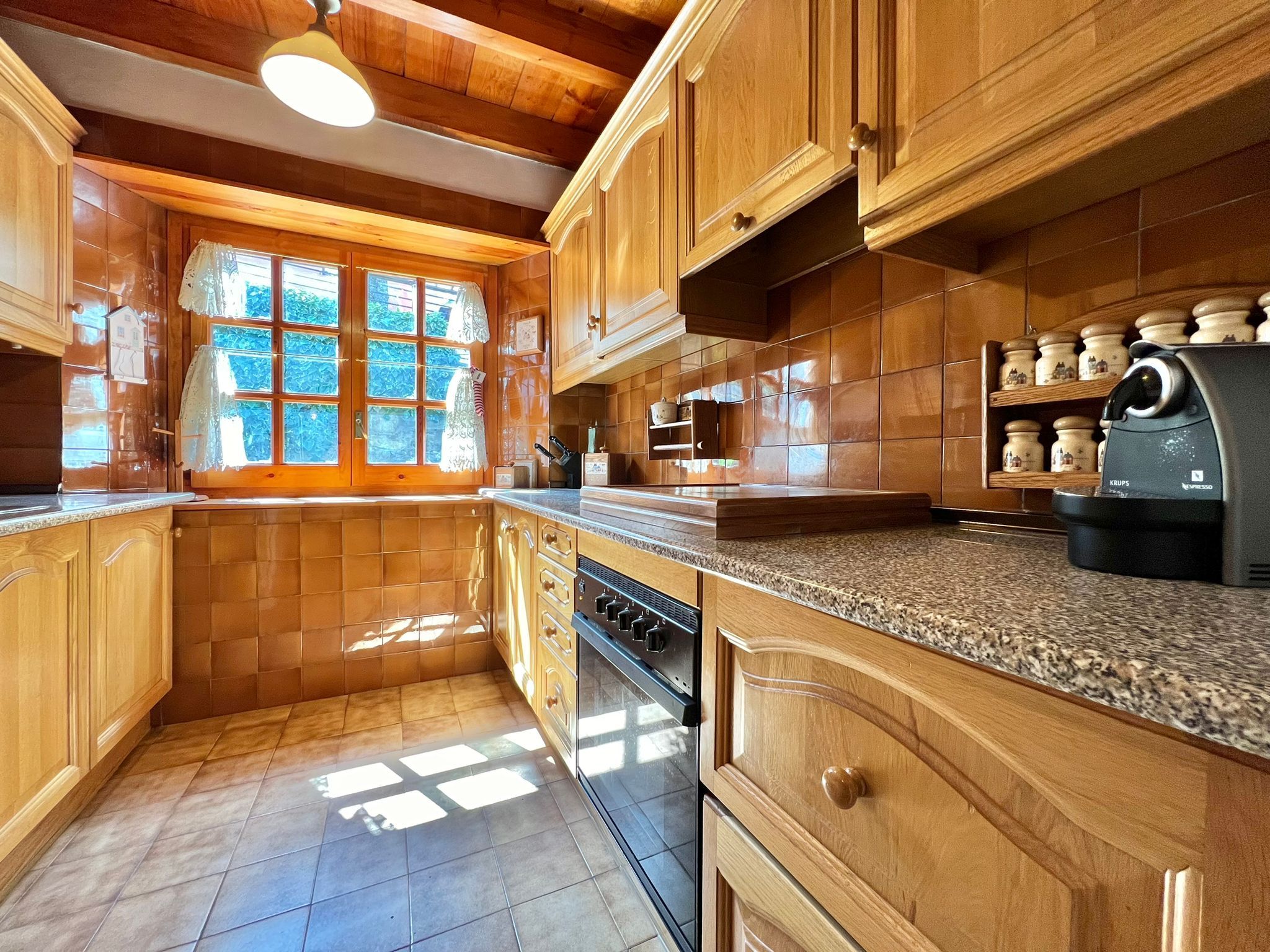 Cocina equipada cerrada con posibilidad de abrirse a un soleado salón comedor con chimenea de leña y magníficas vistas desde la terraza a la Val d'Aran.