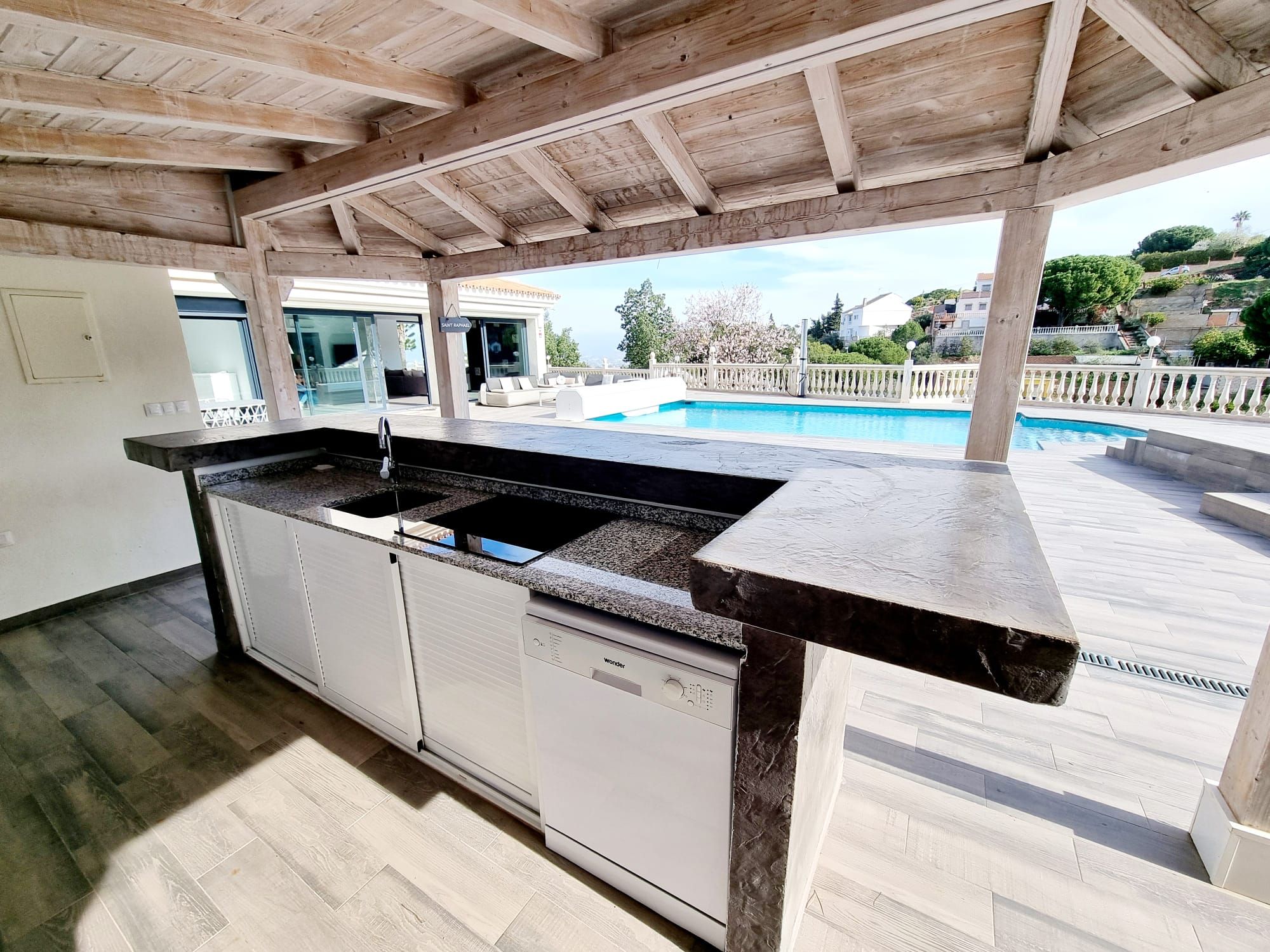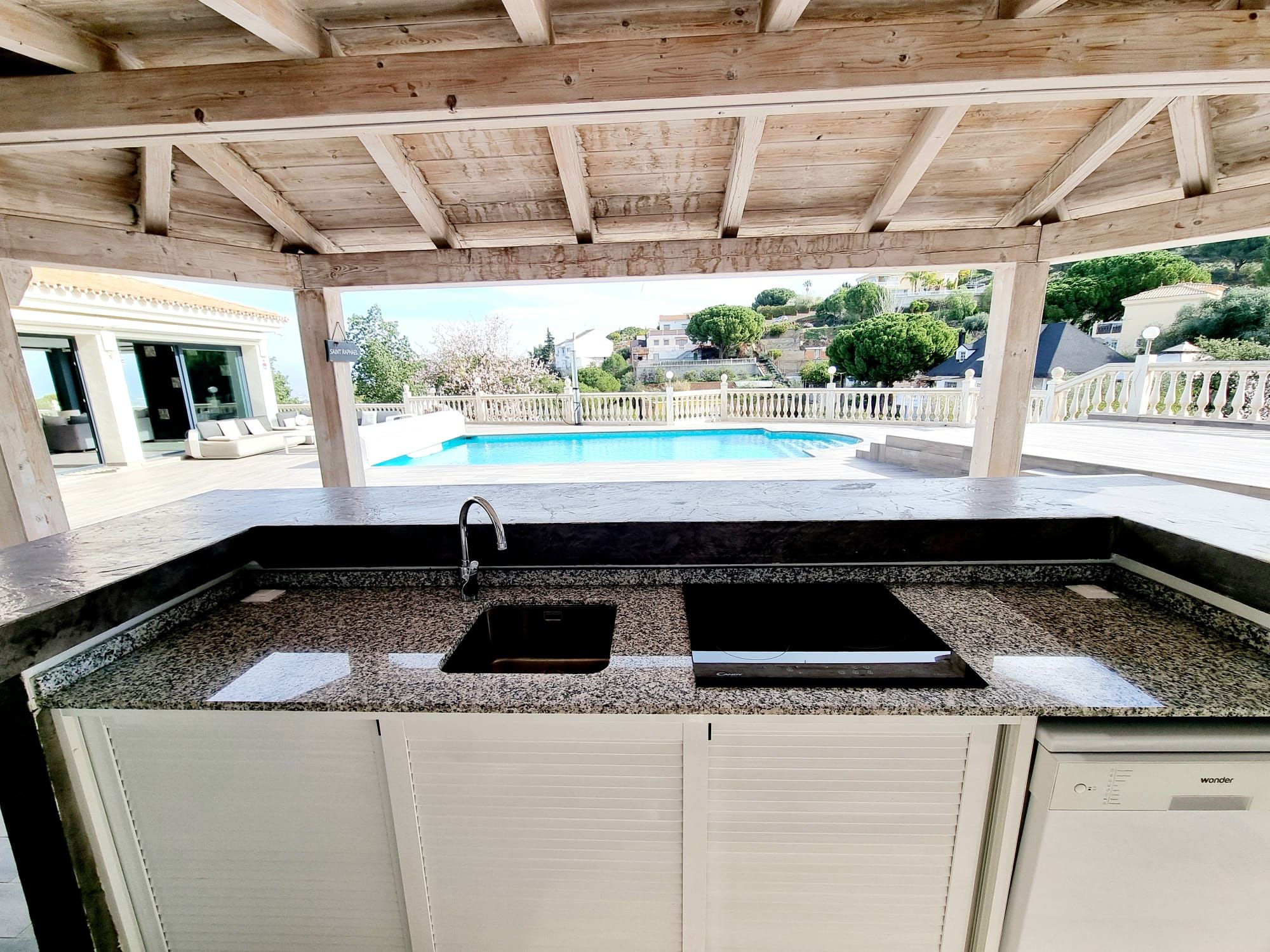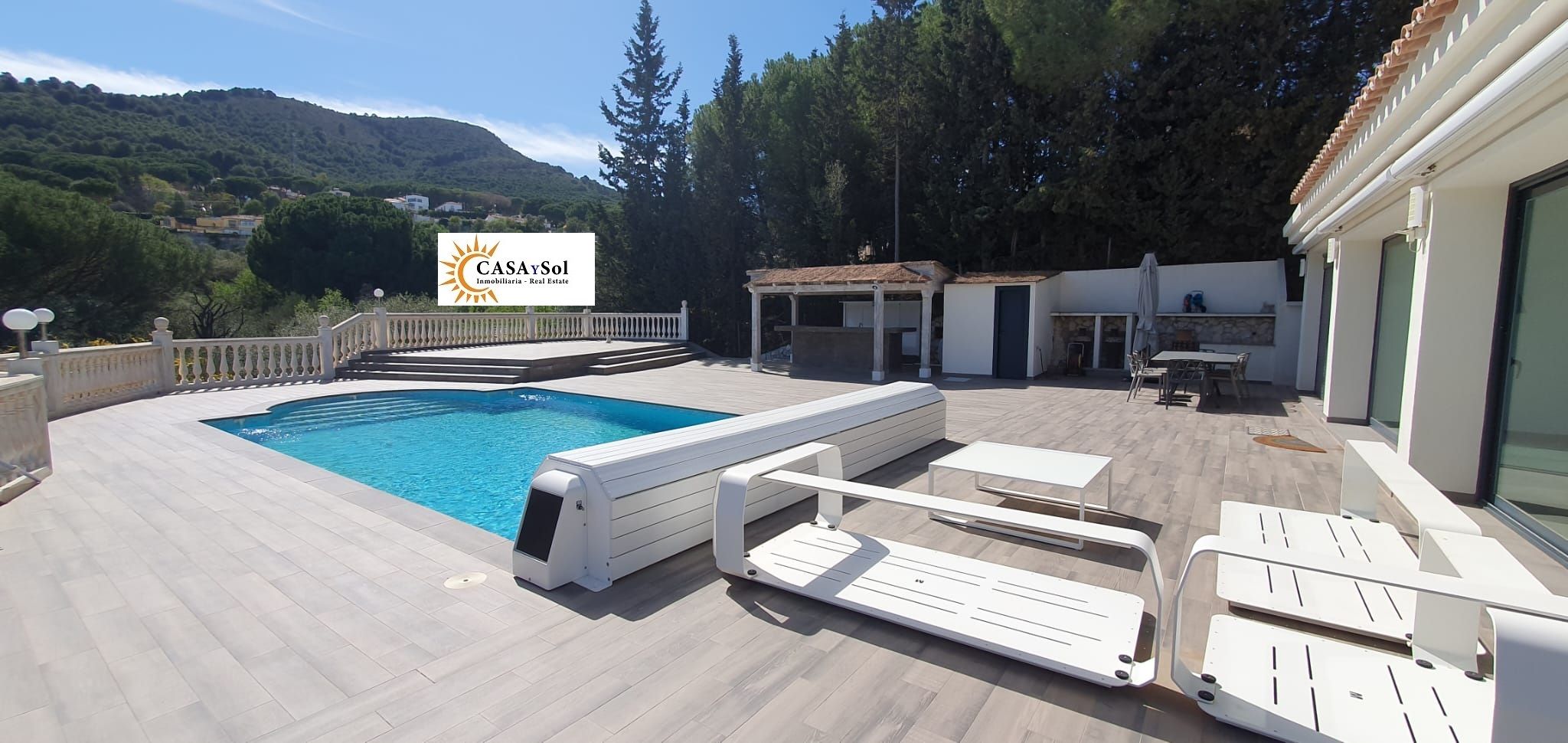 Una parte importante de esta preciosa villa es su zona de piscina (con cubierta para el invierno), grandes terrazas con suelo de porcelánica y una gran cocina de verano totalmente equipada y bajo una original pergola, espacio barbacoa y un baño completo.