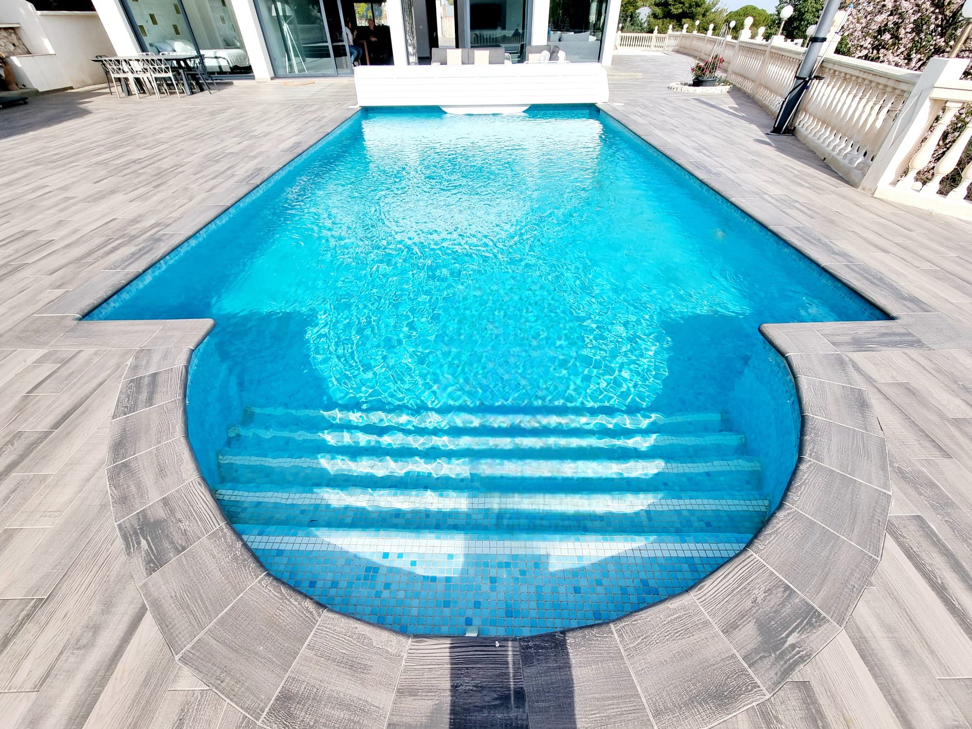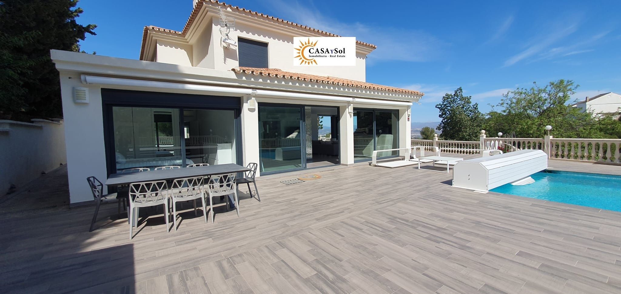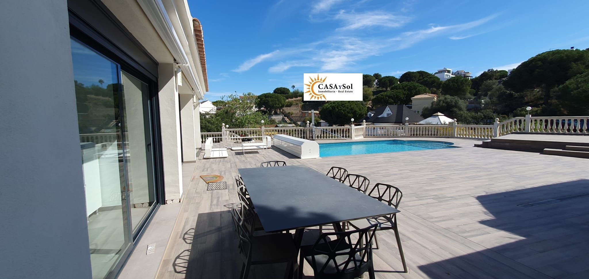 Una parte importante de esta preciosa villa es su zona de piscina (con cubierta para el invierno), grandes terrazas con suelo de porcelánica y una gran cocina de verano totalmente equipada y bajo una original pergola, espacio barbacoa y un baño completo.