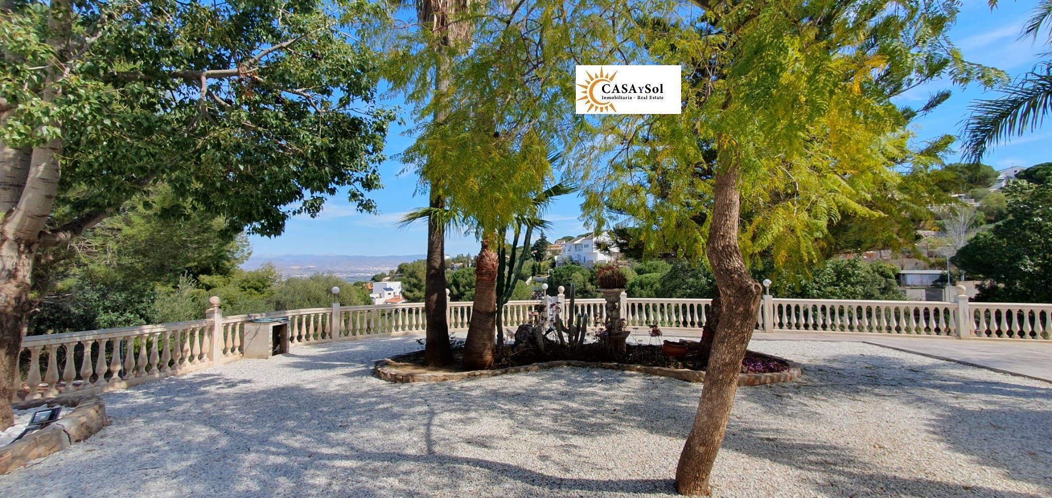 Gran parcela ajardinada, riego automático, iluminación nocturna.