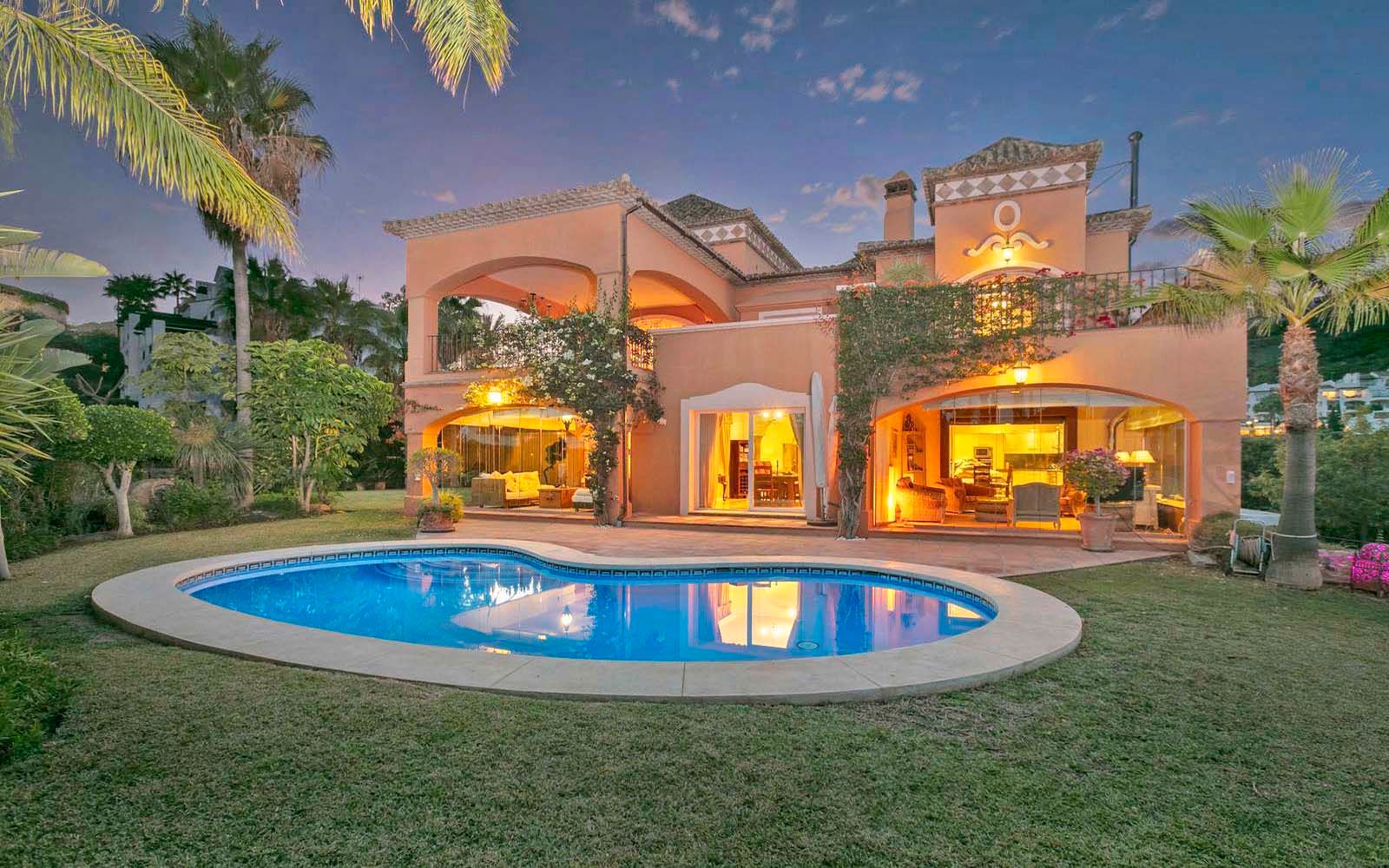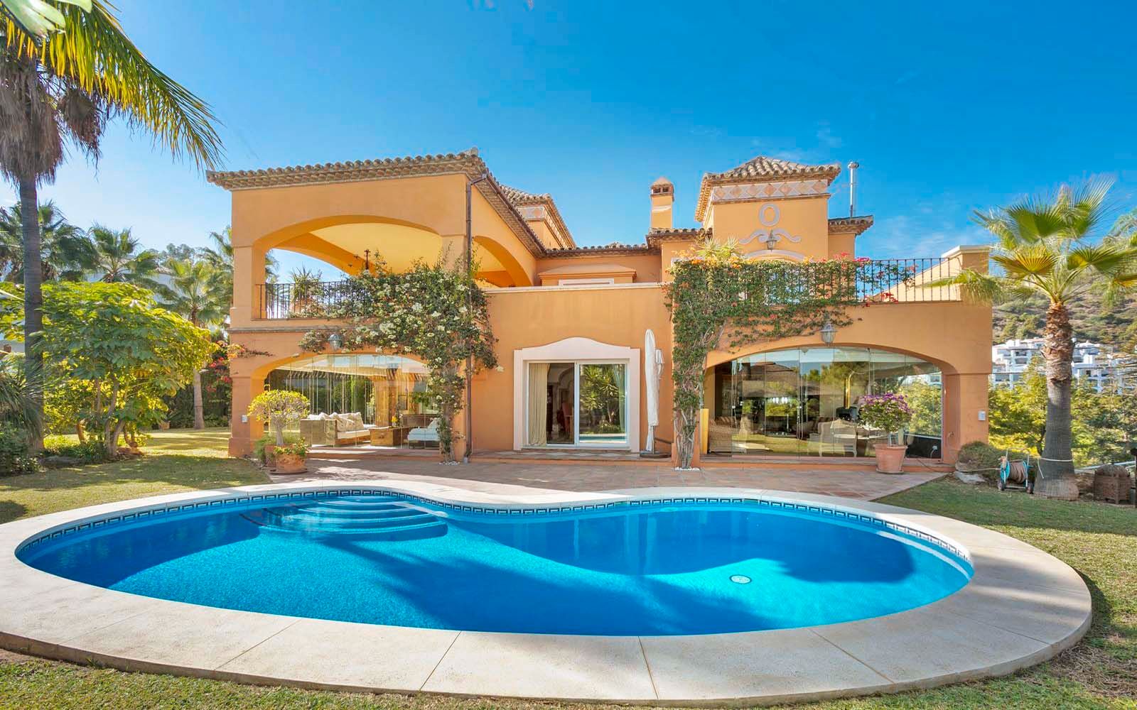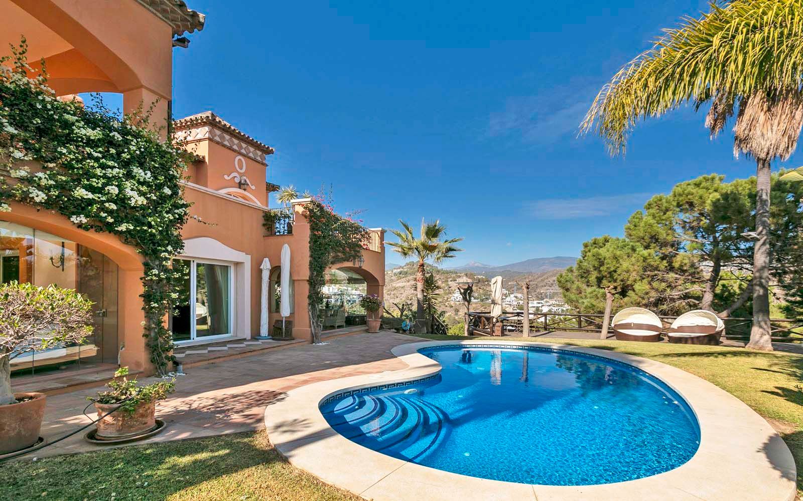 Magnifica villa en la Quinta, Benahavis, excelente situación con vistas panorámicas. La villa está construida en una parcela de 1700m2, haciendo esquina. Tiene 686m2 construidos y 126m2 de terrazas. Zona tranquila y bien comunicada cerca del club de golf y a poca distancia en coche de Puerto Banus. Tiene un bonito jardín en un terreno totalmente llano de césped, piscina de agua salada con terraza y cenador al aire libre con barbacoa. La casa tiene 4 dormitorios, 4 baños y aseo de cortesía. Está distribuida en tres niveles. Nivel principal con un amplio hall de entrada con un techo alto con cúpula, salón comedor con chimenea y acceso al porche acristalado con zona de estar, cocina totalmente equipada con zona de desayuno y acceso a una terraza acristalada, dormitorio de invitados con baño en suite y terraza con vistas. Planta primera 3 dormitorios y 3 baños en suite el dormitorio principal con vestidor, baño con jacuzzi y amplia terraza con vistas al mar y a la montaña. La planta del semi sótano, de 300m2 está a nivel del jardín, con un gran potencial de desarrollo. Actualmente hay una oficina, almacén, sala de máquinas, cuarto de servicio y un espacioso garaje. Además hay amplia zona de aparcamiento en la parcela en superficie. Suelo radiante en baños, aire acondicionado frío-calor en toda la casa con unidades individuales en cada habitación, calefacción central por radiadores. Gastos comunidad 23€/mes, IBI 2657€/anuales