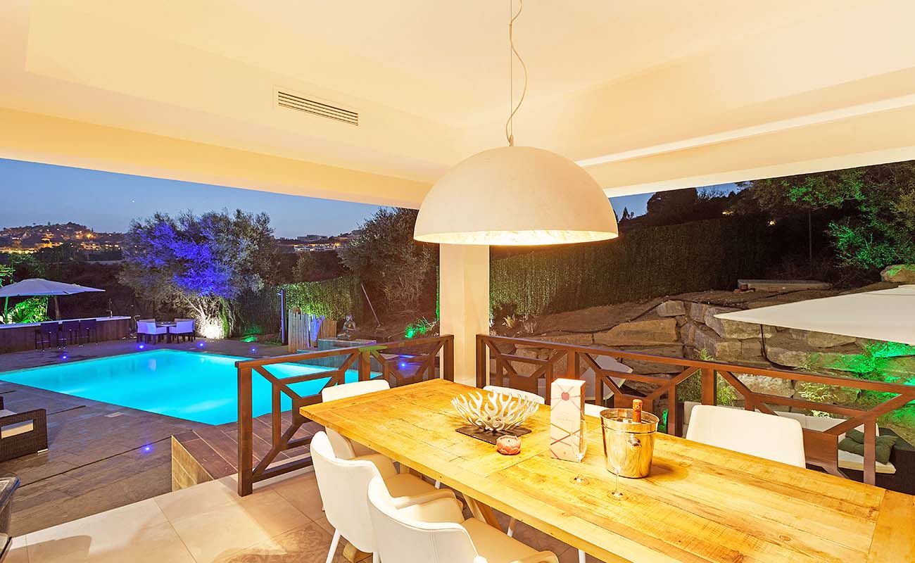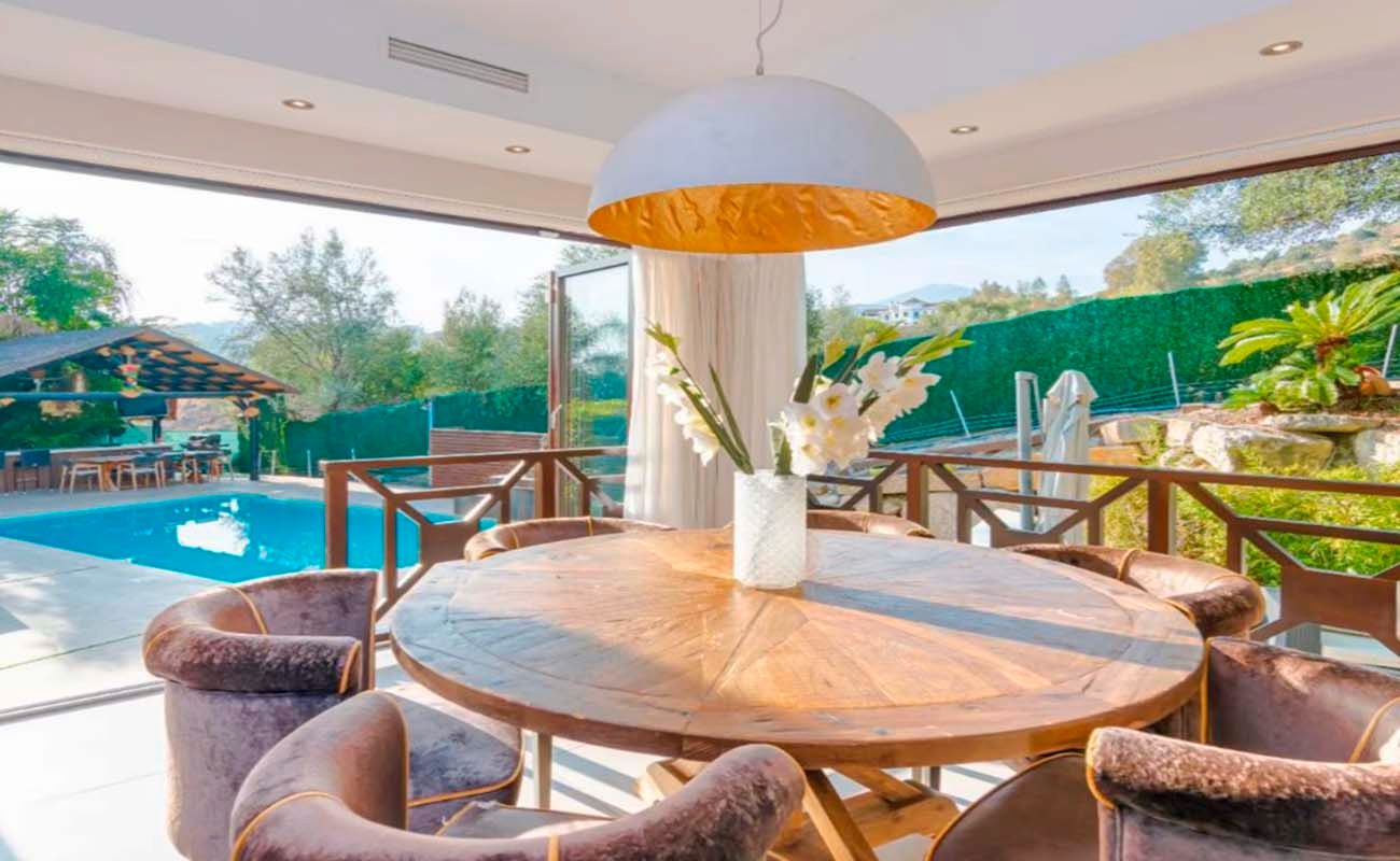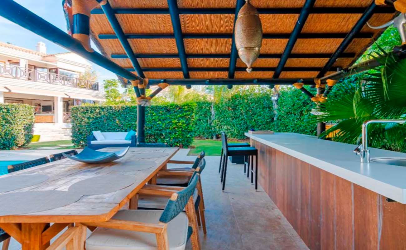 Villa en el corazón del Valle del Golf, en Nueva Andalucía, junto al campo de golf Los Naranjos, dentro de una urbanización tranquila con barrera de seguridad. La casa está prácticamente nueva construida, en una parcela de 1.200 m2 . Tiene 398 m2construidos con orientación sur-oeste. Está distribuida: Hall de entrada, amplio salón comedor dividido en dos ambientes y con salida al porche cubierto y acceso al jardín y la piscina, con cenador de verano cubierto, cocina equipada con isla, 5 dormitorios con 5 baños en suite y un aseo de cortesía, terrazas en la primera planta. Amplio sótano que dispone de zona de spa, sala de juegos y garaje para 2 coches. Excelentes calidades, aire acondicionado, armarios empotrados, trastero, amueblado. Gastos de IBI 2148€/año, comunidad anual 480€/anuales.