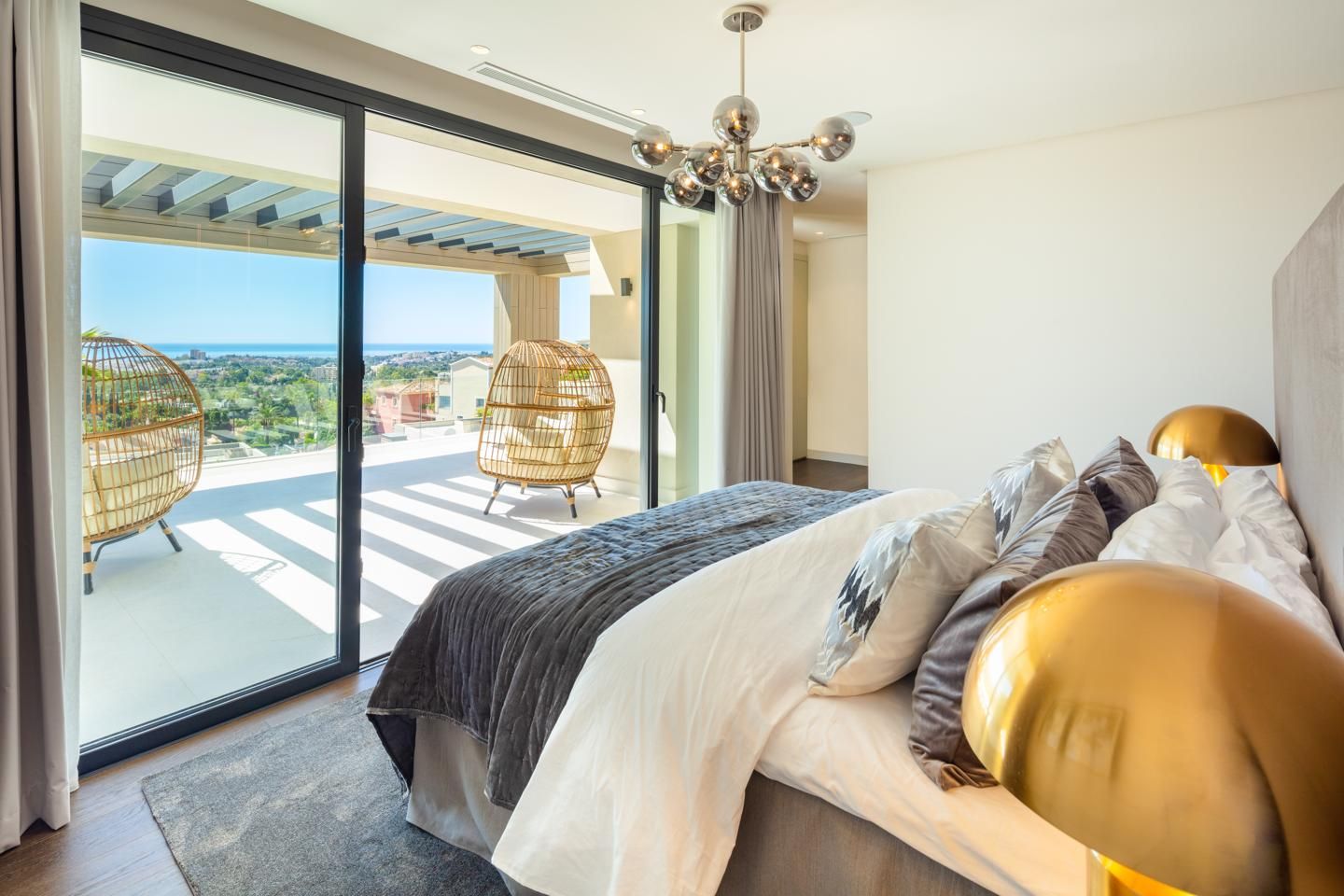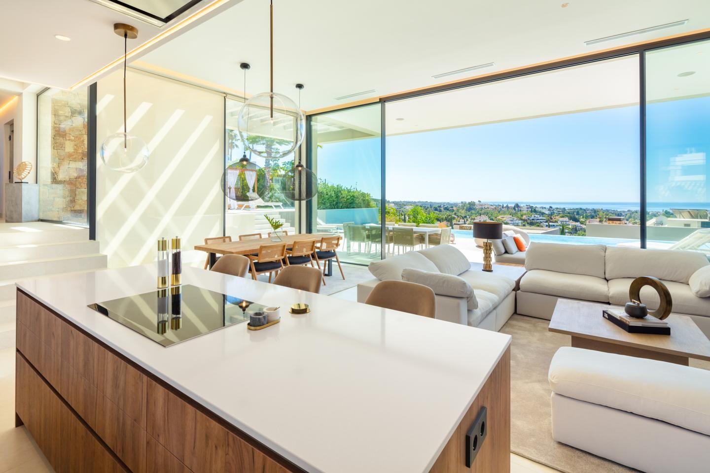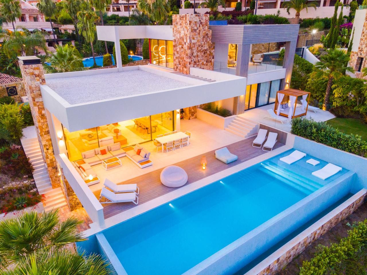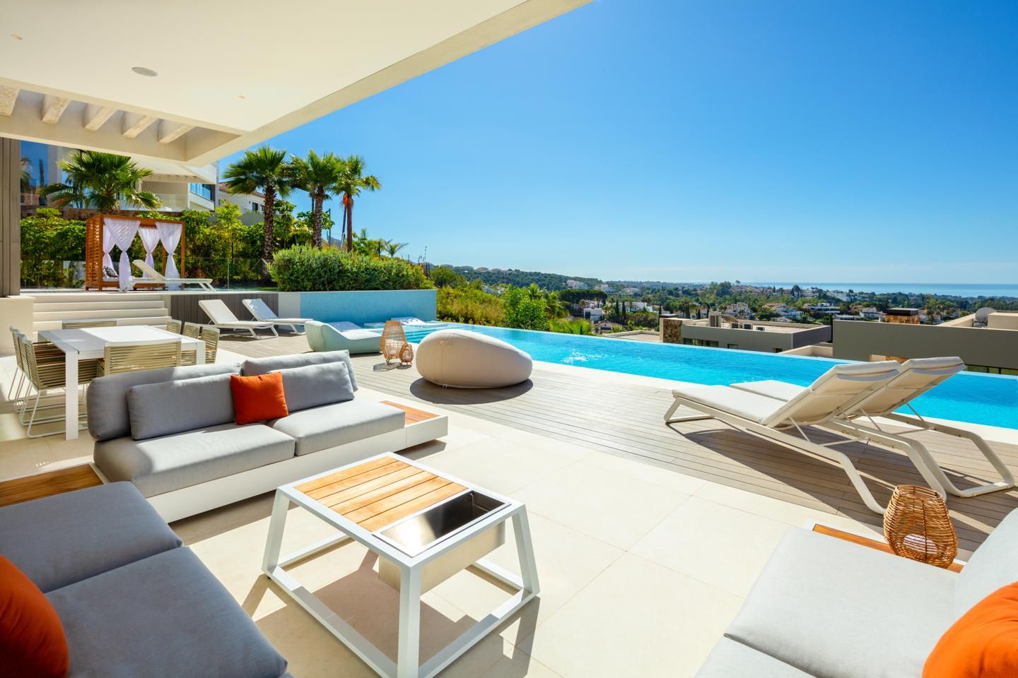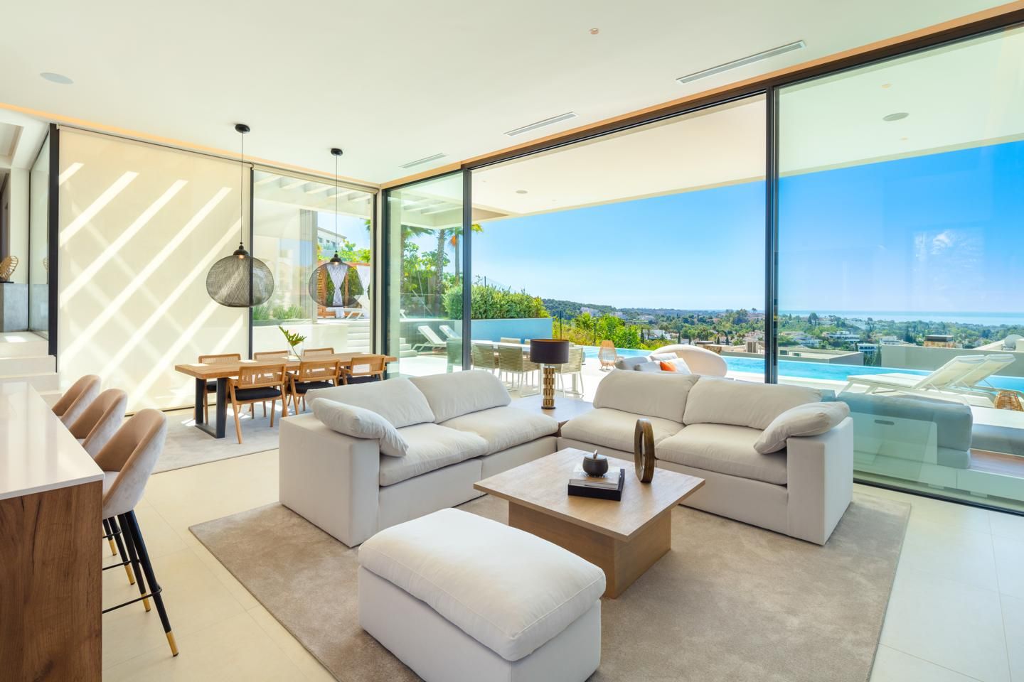Exclusiva villa de lujo, con vistas al mar y a la montaña, 5 dormitorios, 4 baños y 1 aseo de invitados. Situada en el Valle del Golf de Marbella, cerca de Las Brisas Golf, Puerto Banús, Marbella centro, restaurantes, tiendas y todos los servicios.