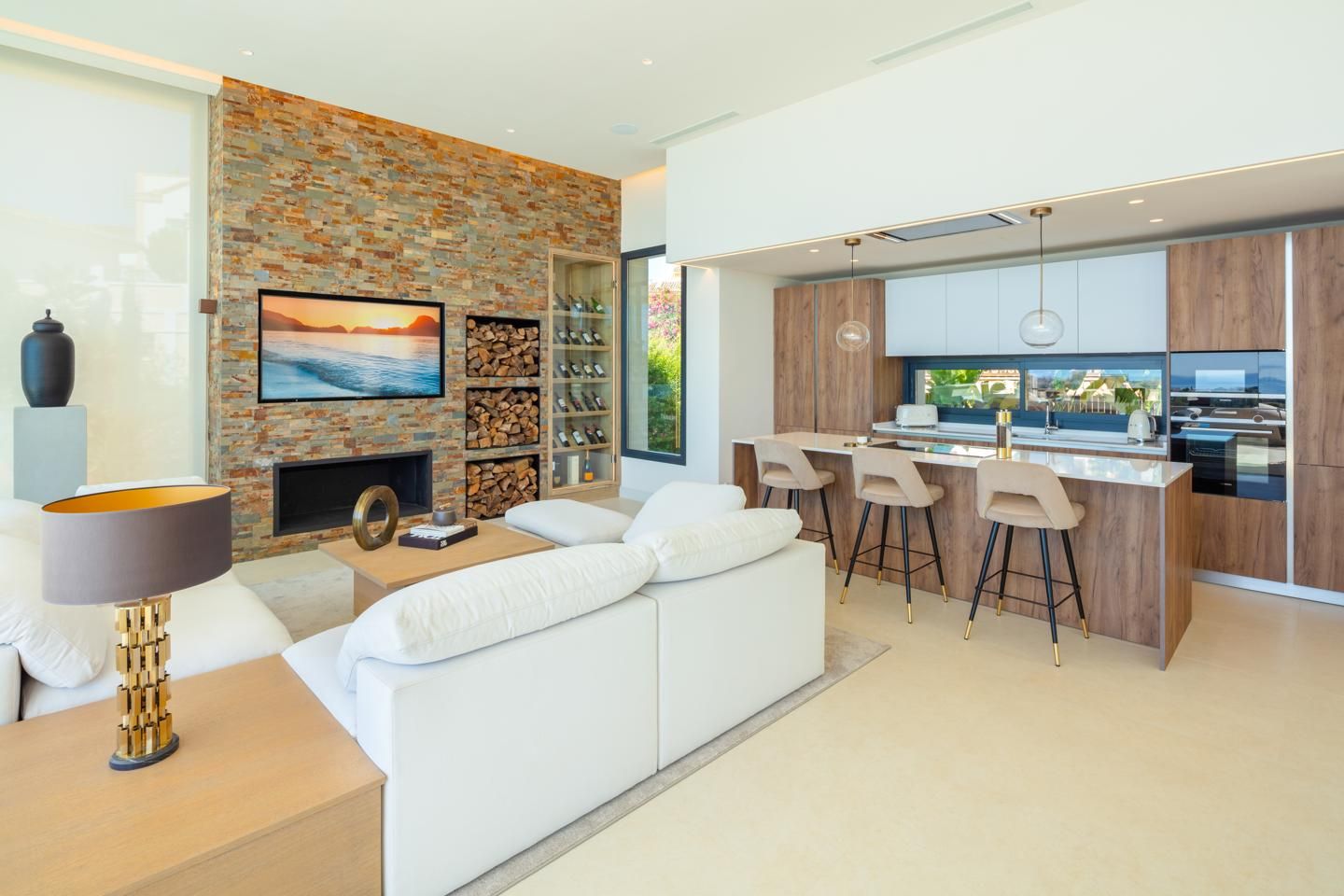 La villa se distribuye en dos niveles y un sótano, donde cada área ha sido cuidadosamente diseñado para maximizar sus vistas al mar, así como la integración de las zonas internas con las amplias terrazas, piscina y jardines.