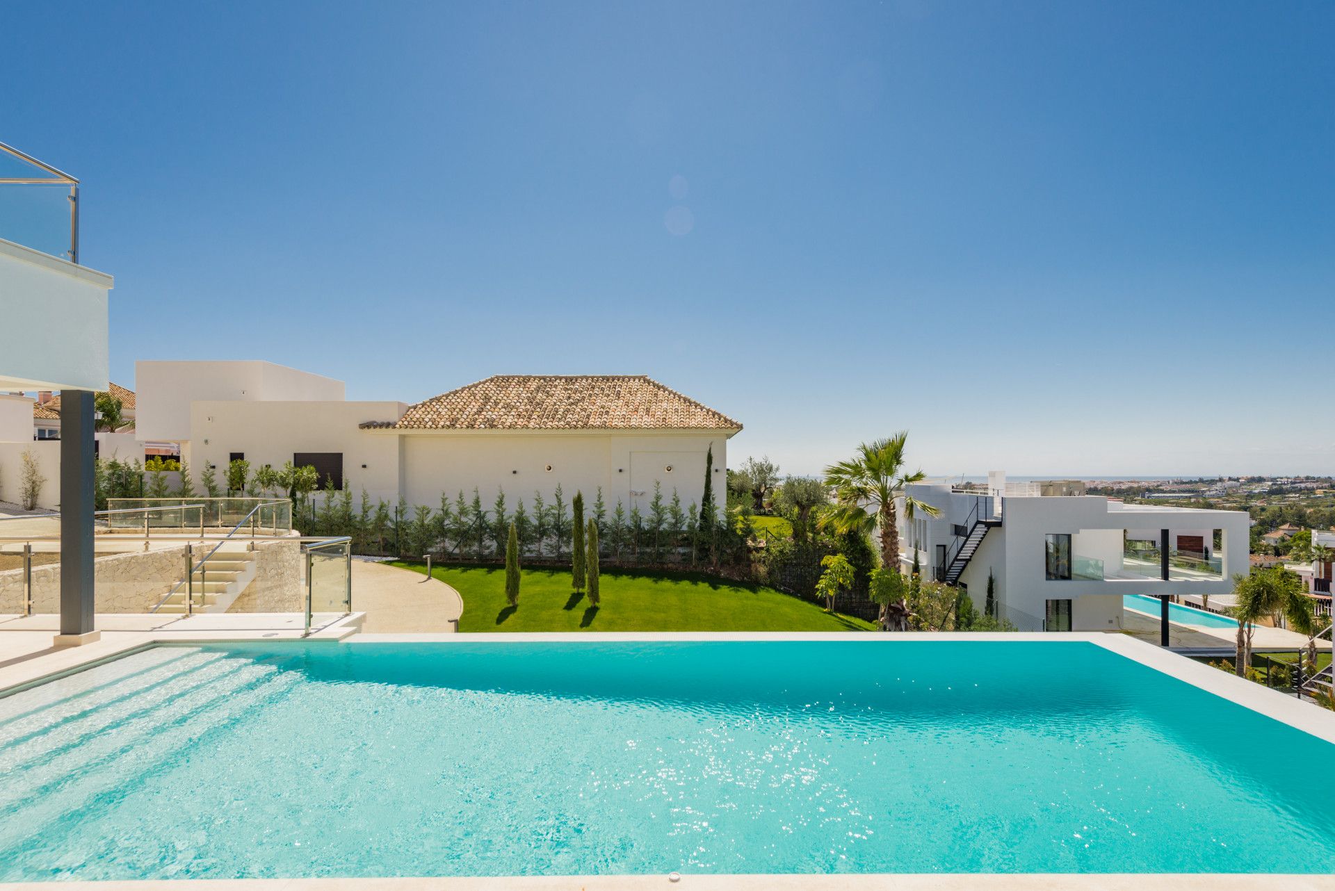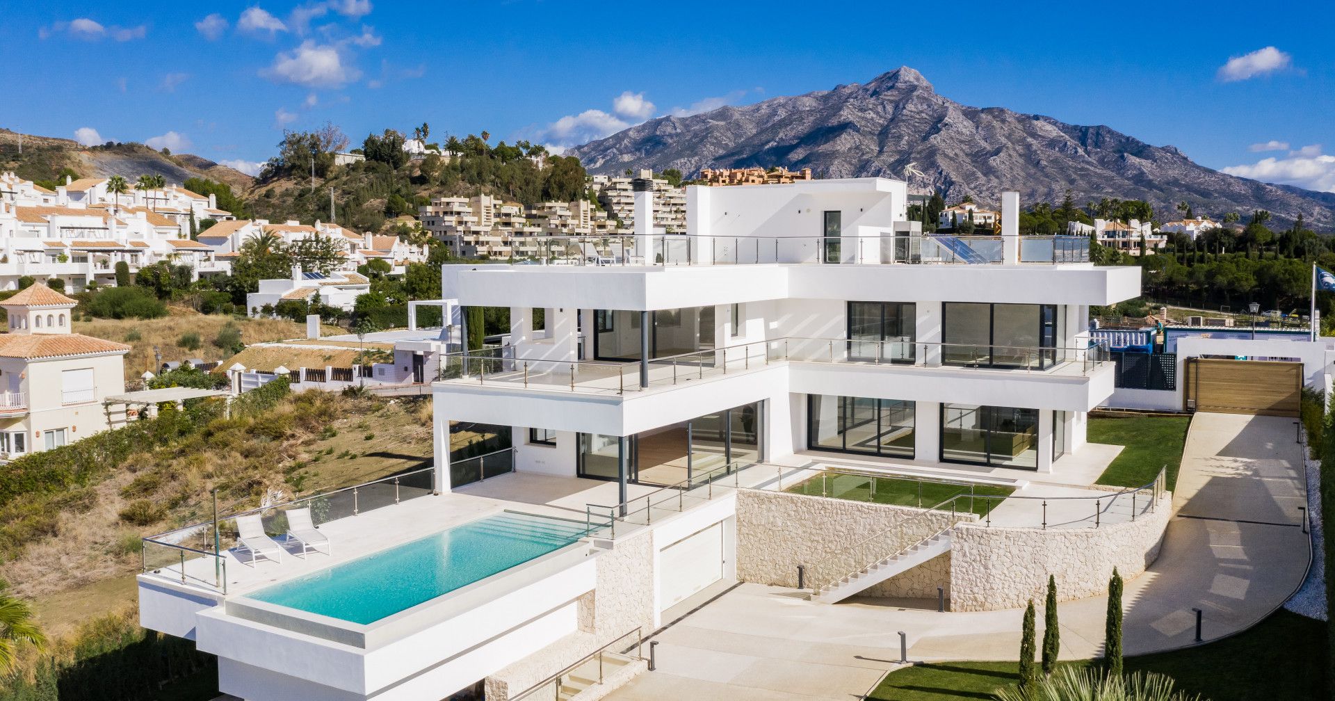 Esta exquisita villa en venta en Nueva Andalucía, Marbella, personifica la vida contemporánea de lujo. Ubicado cerca del prestigioso Club de Golf Los Naranjos, "Condor Viejo" es una villa moderna de nueva construcción que cuenta con los más altos estándares de acabado. La propiedad está situada en una tranquila calle de calle sin salida, elevada para ofrecer impresionantes vistas del valle y el mar. En días claros, las vistas se extienden a Gibraltar y las montañas de Marruecos, proporcionando un impresionante escenario para la vida cotidiana.