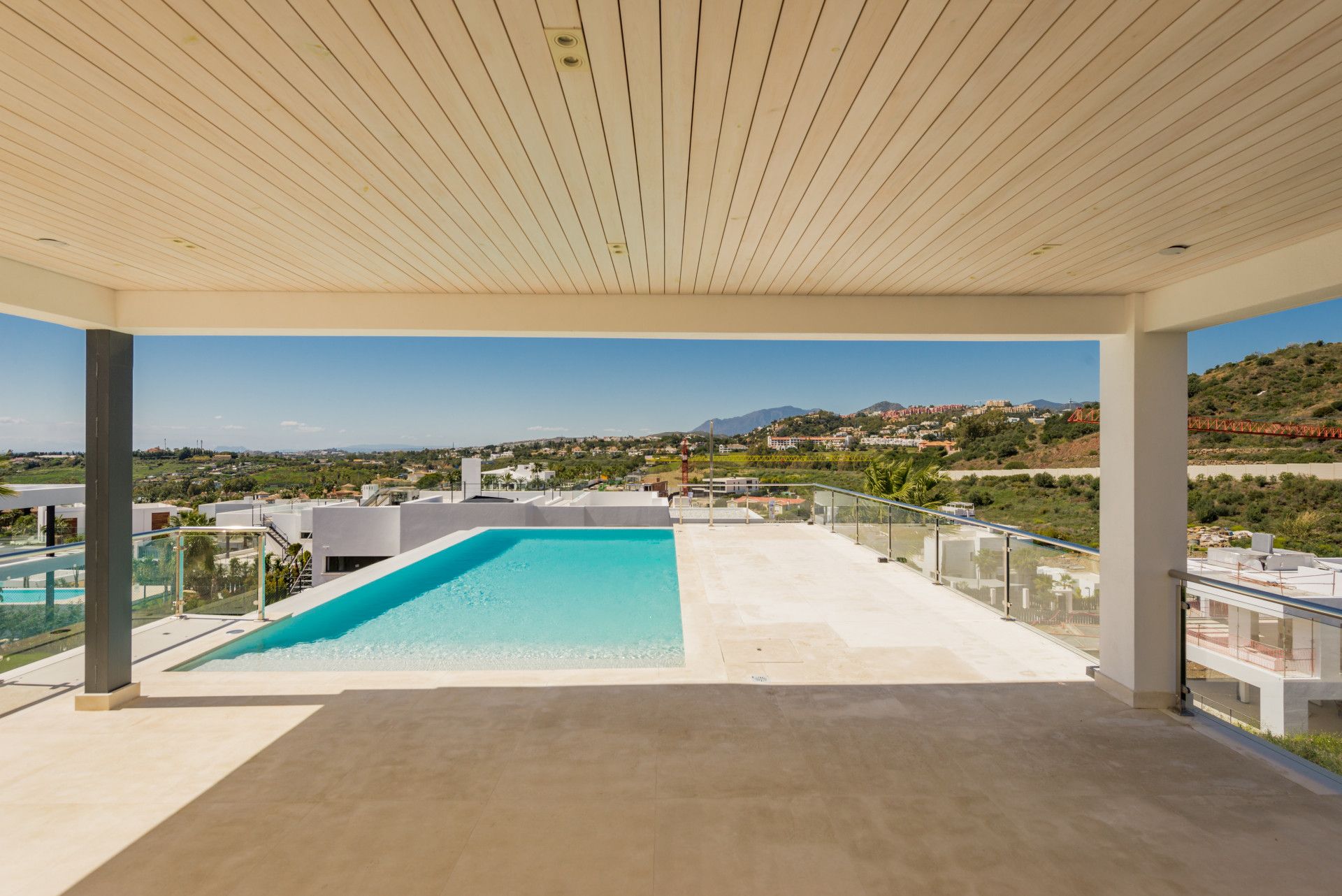 La villa abarca un impresionante 590m2 de espacio construido, complementado con una generosa terraza de 280m2 y situado en una parcela de 1.200m2. Diseñado para maximizar la luz natural, la villa se enfrenta al oeste y al sur, asegurando que se baña a la luz solar durante todo el día. La terraza de la cocina y el comedor disfruta del sol de la mañana, mientras que las otras terrazas capturan el sol hasta que se pone, haciéndolos perfectos para cenar o disfrutar de una bebida mientras miran espectaculares puestas de sol.