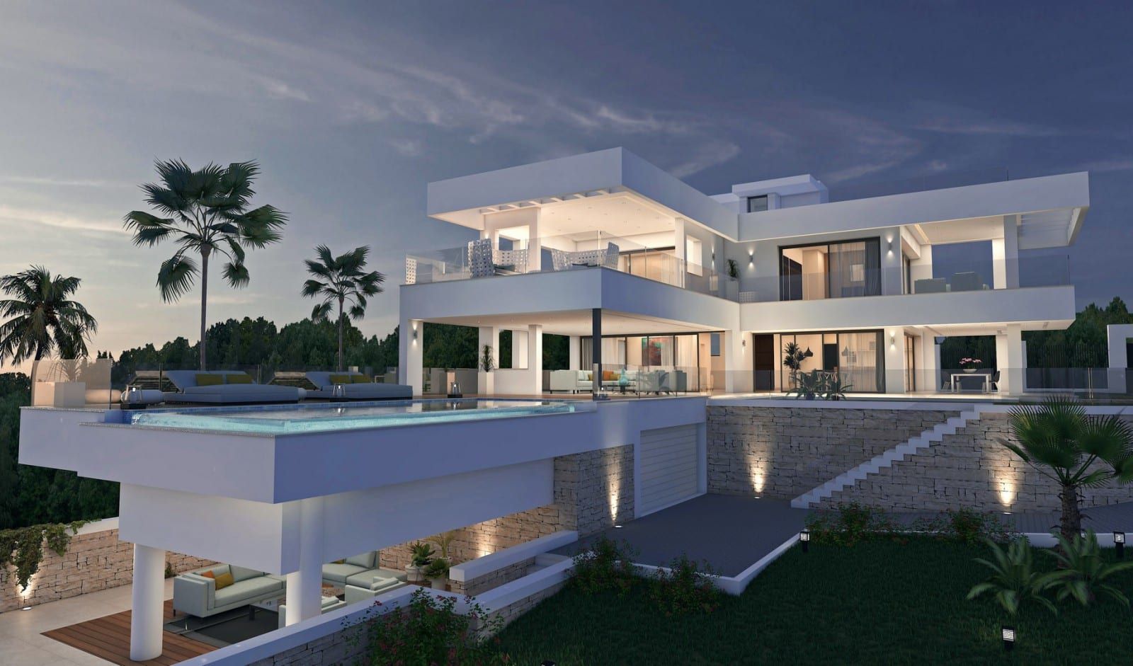 Level 0: Large living room, dining area, luxury open-plan kitchen, guest WC, covered terrace, and infinity pool with pre-installation for heating.