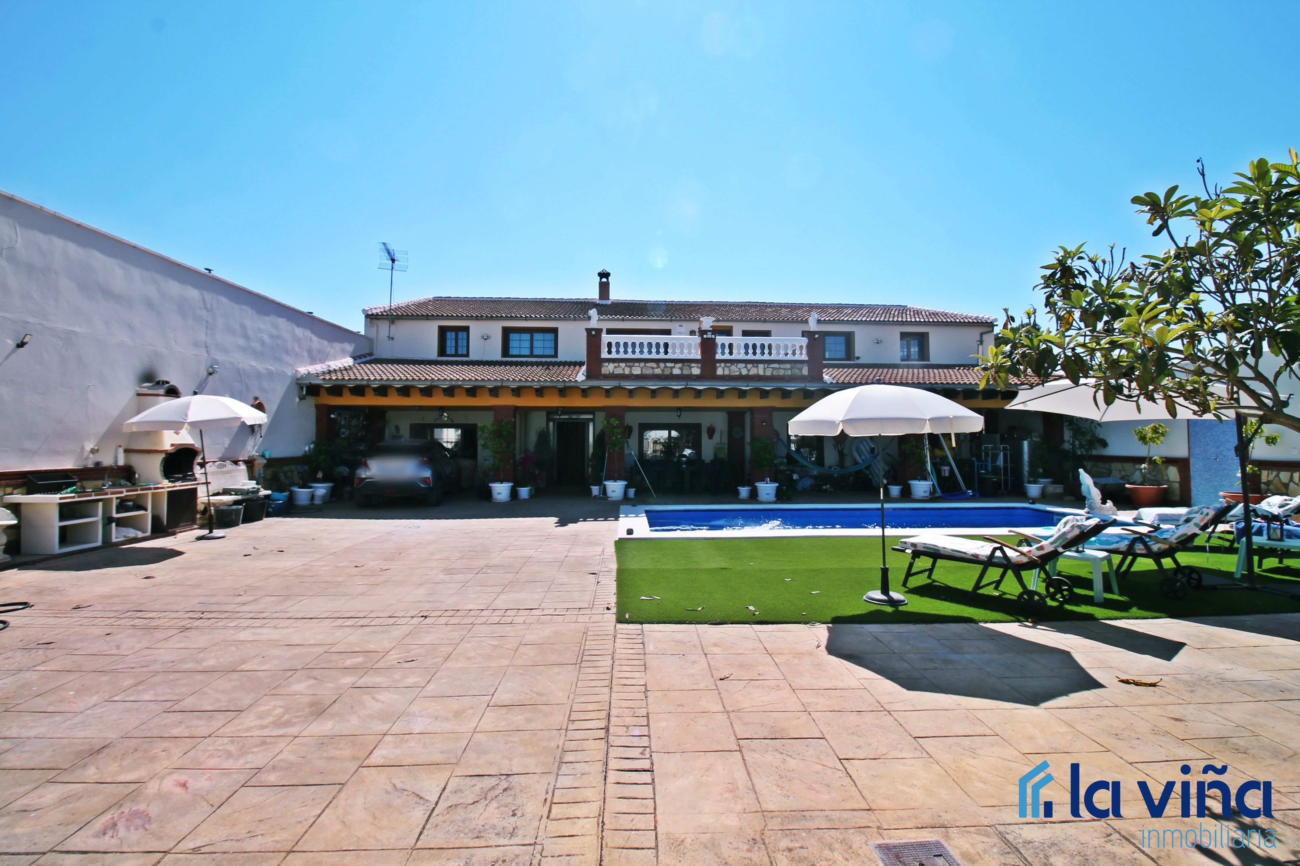 El patio de esta casa también cuenta con capacidad para aparcar 9 coches, más una zona de barbacoa, y una casa de invitados independiente que incluye un salón, un cuarto de baño y dos dormitorios, proporcionando privacidad adicional para invitados o familiares.