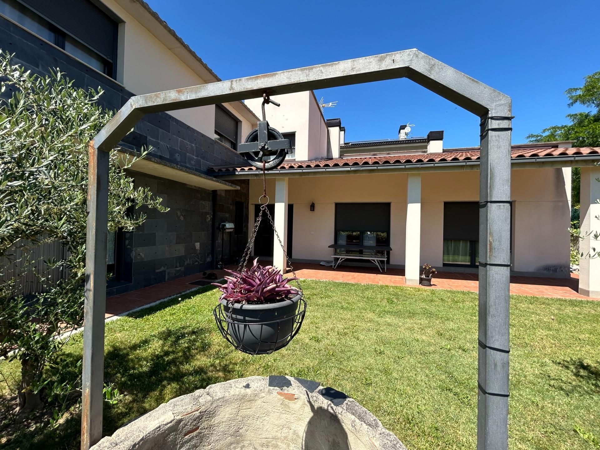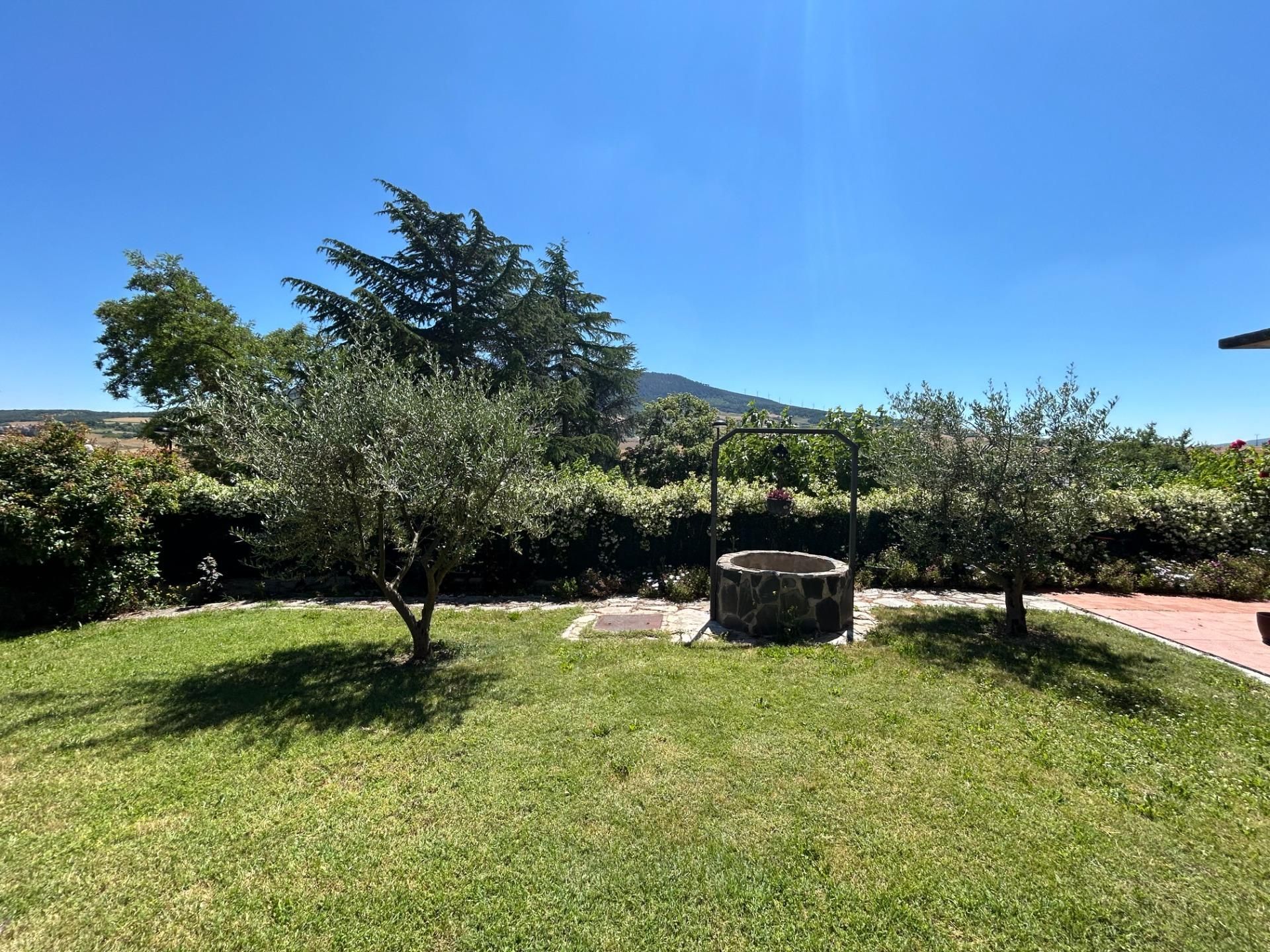 Jardín con porche, pozo, zona destinada para huerta y en la parte trasera de la casa, leñera.