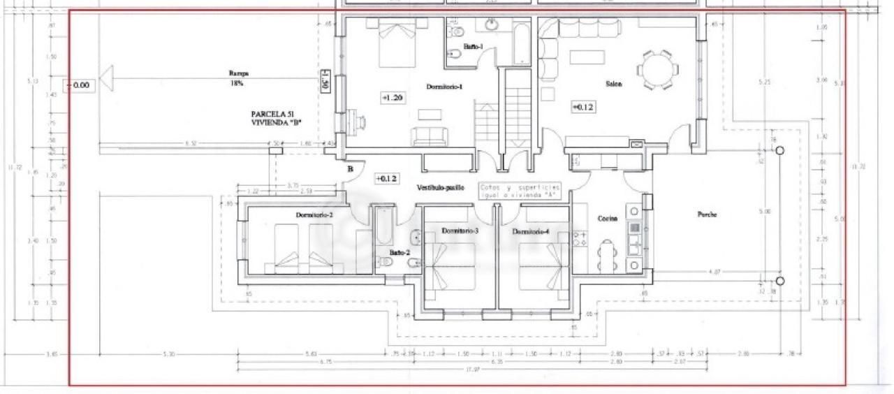 Planta baja, salón comedor con salida a porche, cocina sin amueblar, tres dormitorios dobles y un baño: subiendo siete peldaños, acceso a dormitorio principal con baño en suite.