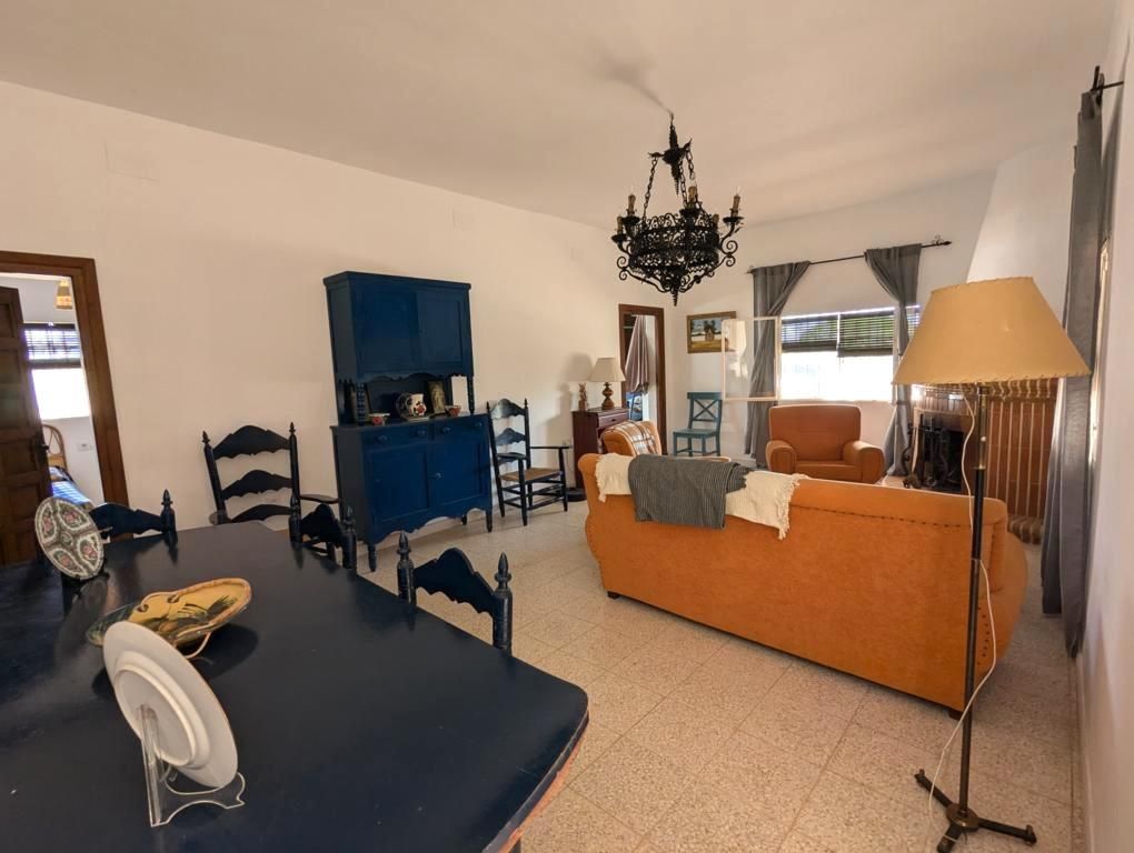 Tiene un magnífico porche en forma de L, que accede a un amplio y luminoso salón, con chimenea, con ventanales que aportan mucha luminosidad, y espacio suficiente para diferenciar zona de descanso y zona de comedor.
