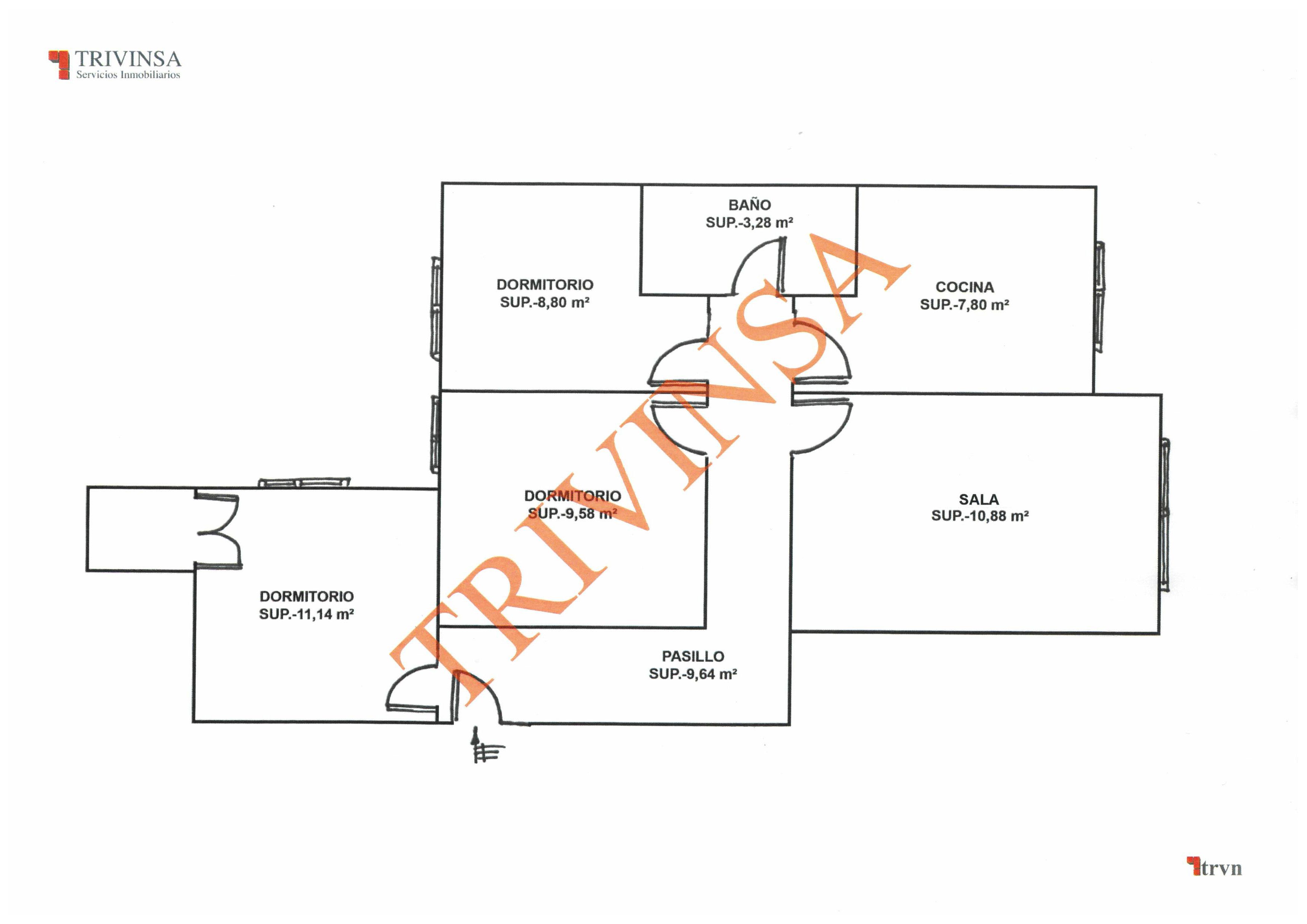 Vivienda de 61,48 m² que se distribuyen en sala, cocina, 3 dormitorios y baño.