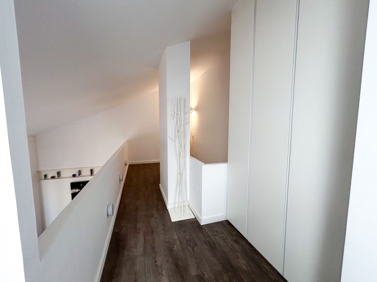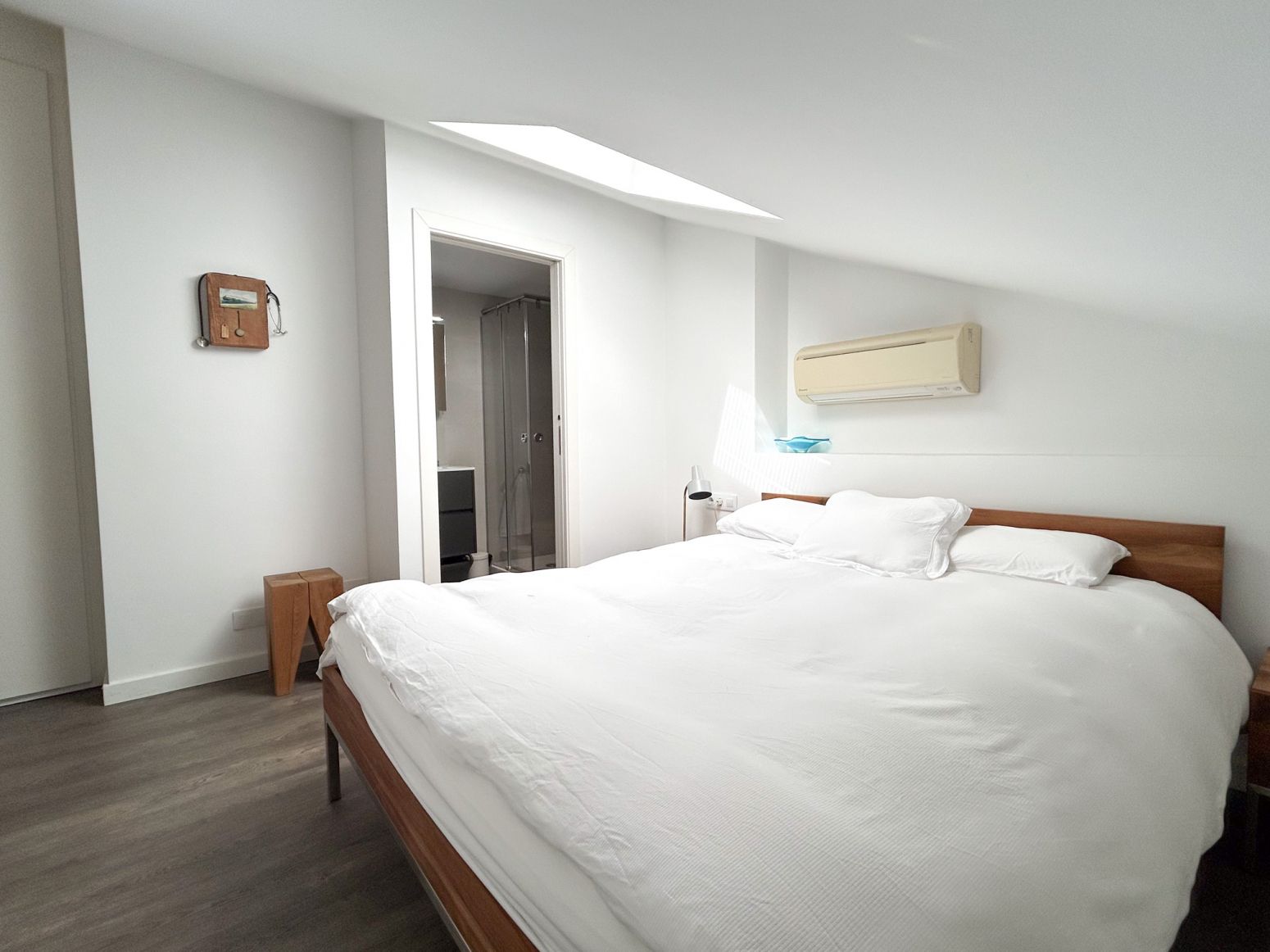 A través de una escalera interna de diseño minimalista accedemos a la segunda planta. En ella encontramos un vestidor y un bonito dormitorio con baño completo. Esta estancia tiene un techo en forma de buhardilla que le da un toque muy especial. También dispone de una segunda zona de armarios y almacenaje.