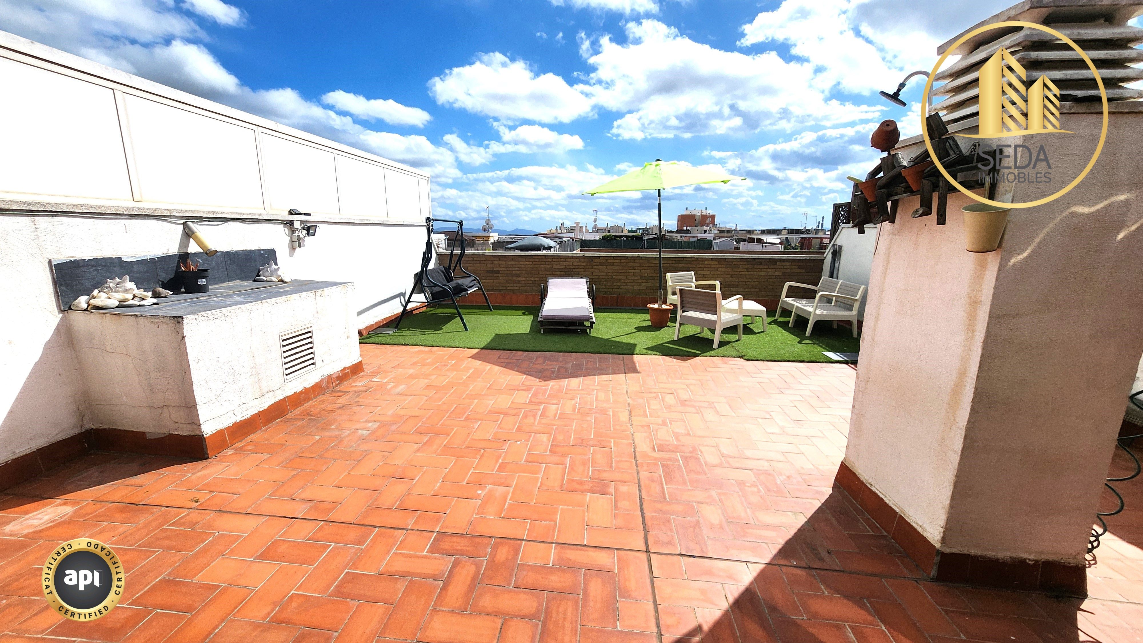 Just sortim de l'habitatge i com si d'un dúplex es tractés pugem les escales que només la usen els dos veïns dels àtics i arribem a la porta d'entrada a la nostra terrassa privada, aquí tenim en el més alt de la finca i amb bones vistes, una terrassa de 80m² on tenen muntat una àmplia caseta de fusta per a poder usar com habitació tipus estudi o zona de oci.