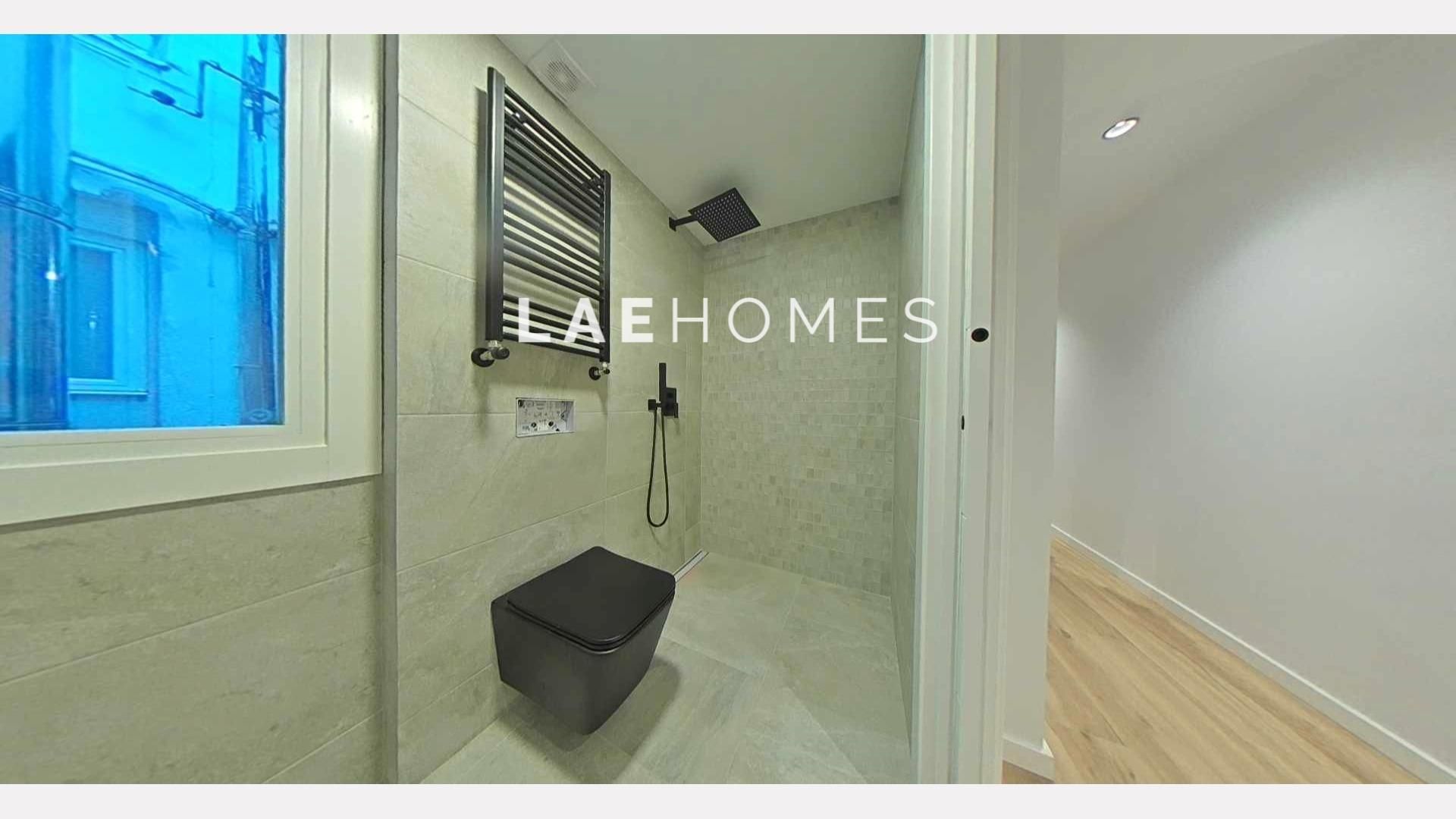 La vivienda incluye un segundo baño completo con acabados premium, como grifería empotrada, inodoro suspendido, moderno mueble lavabo de diseño y plato de ducha a nivel del suelo.