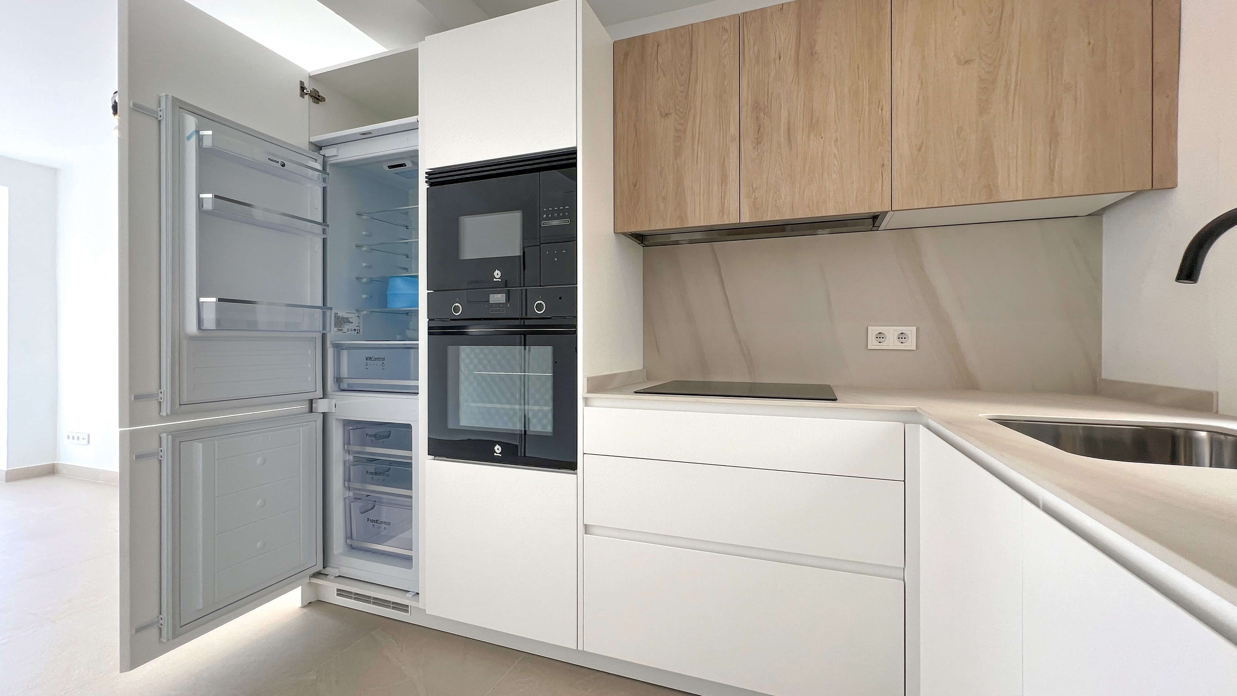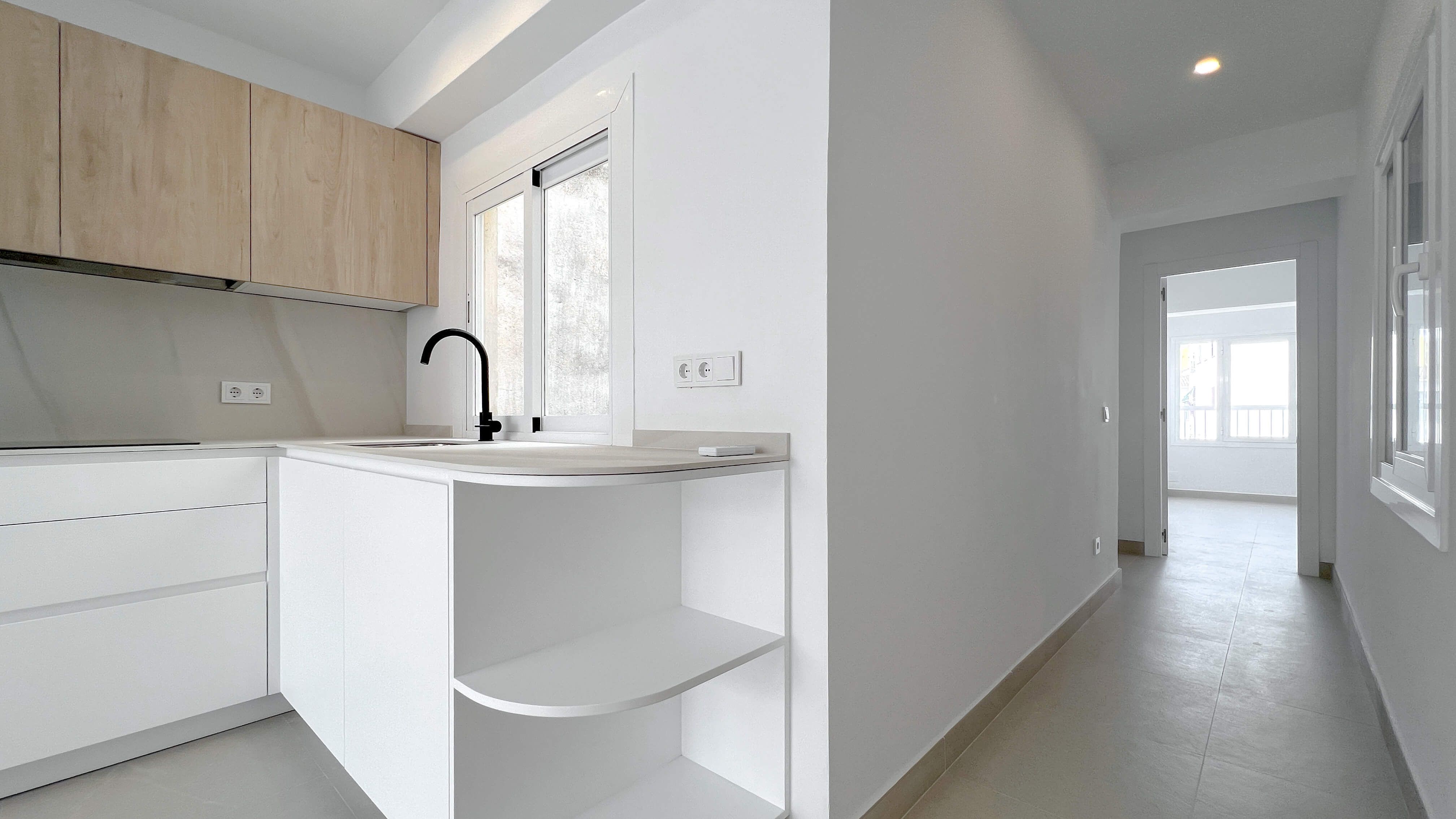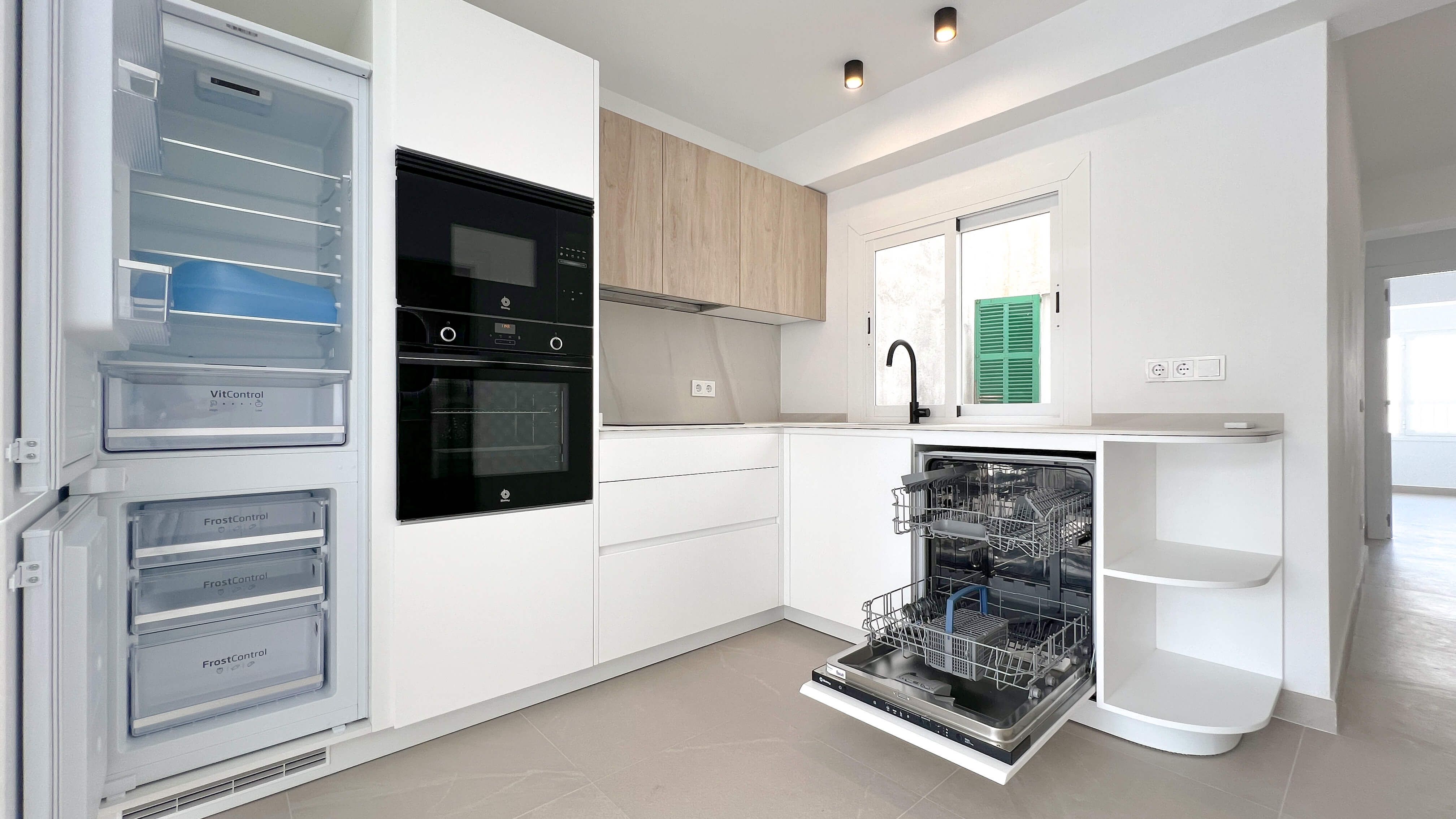 Este apartamento recién renovado, de estilo moderno, se encuentra en el barrio de Palma "El Camp d'en Serralta". La propiedad, que fue construida originalmente en 1974, tiene una superficie habitable de aproximadamente 66 m² y es muy luminosa gracias a las grandes ventanas. Cuenta con dos dormitorios y un baño moderno con ducha (y ventana). En todas las habitaciones se han instalado nuevos aparatos de aire acondicionado (frío/calor) que garantizan una temperatura agradable durante todo el año. En el espacioso salón también se encuentra la moderna y de alta calidad cocina de marca (de Manacor), que está equipada con todos los electrodomésticos comunes. Se pueden ver manillas y grifos negros en todas las puertas y en el baño, que aportan toques decorativos y combinan bien con los azulejos. Durante las obras de renovación, se renovaron por completo las instalaciones eléctricas y de agua, así como las ventanas y puertas de doble acristalamiento. El apartamento está en el segundo piso de un pequeño edificio multifamiliar y no dispone de ascensor ni de plaza de aparcamiento. Además, hay una terraza comunitaria donde también se tiene un pequeño trastero, en el cual está instalada la lavadora y aún queda espacio para sus utensilios personales. Los gastos comunitarios ascienden a 45 euros mensuales y se pagan trimestralmente. Si se ve como el nuevo propietario y tiene un gran interés en la propiedad, no dude en contactarnos. ¡Esperamos su llamada!