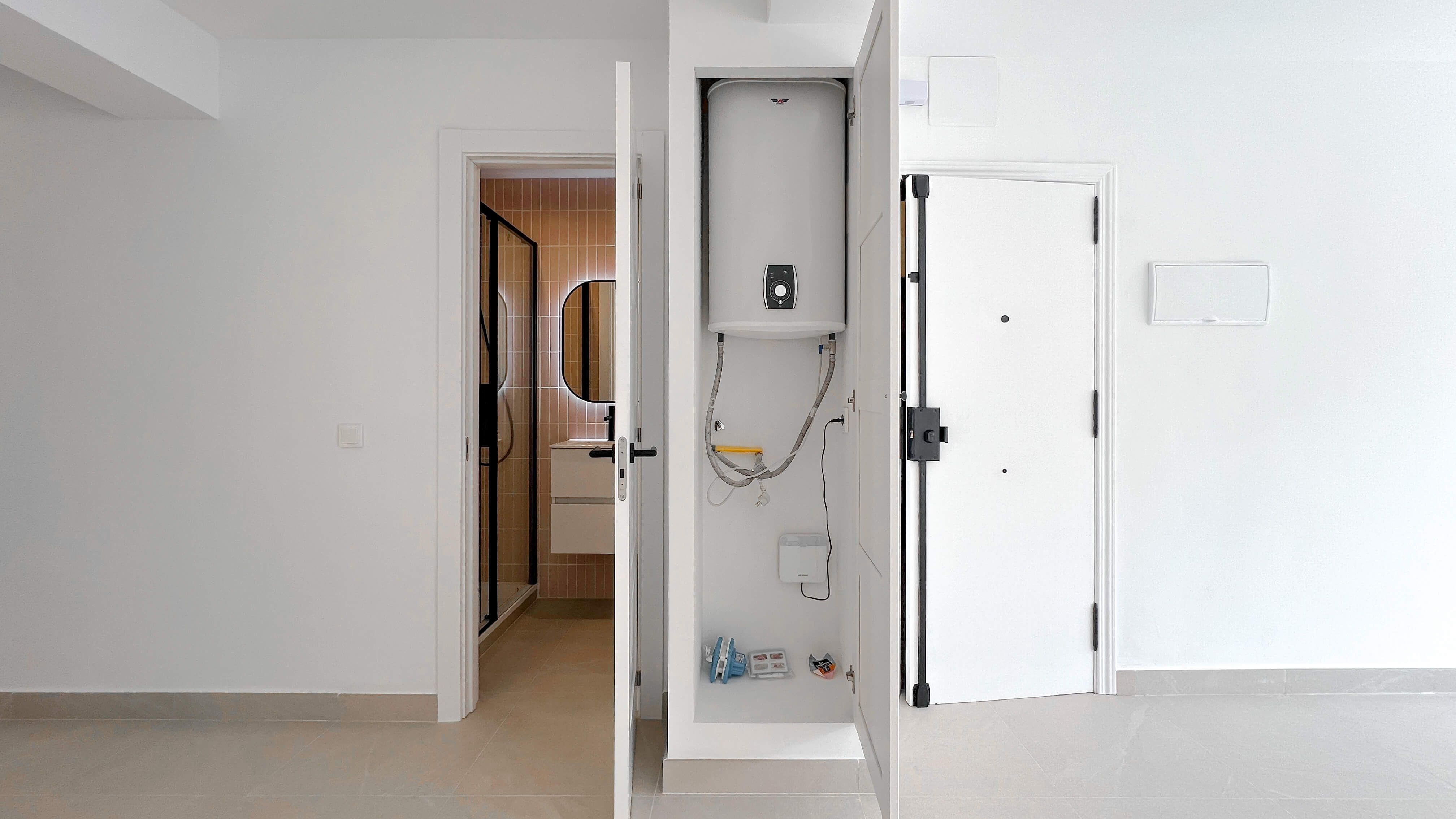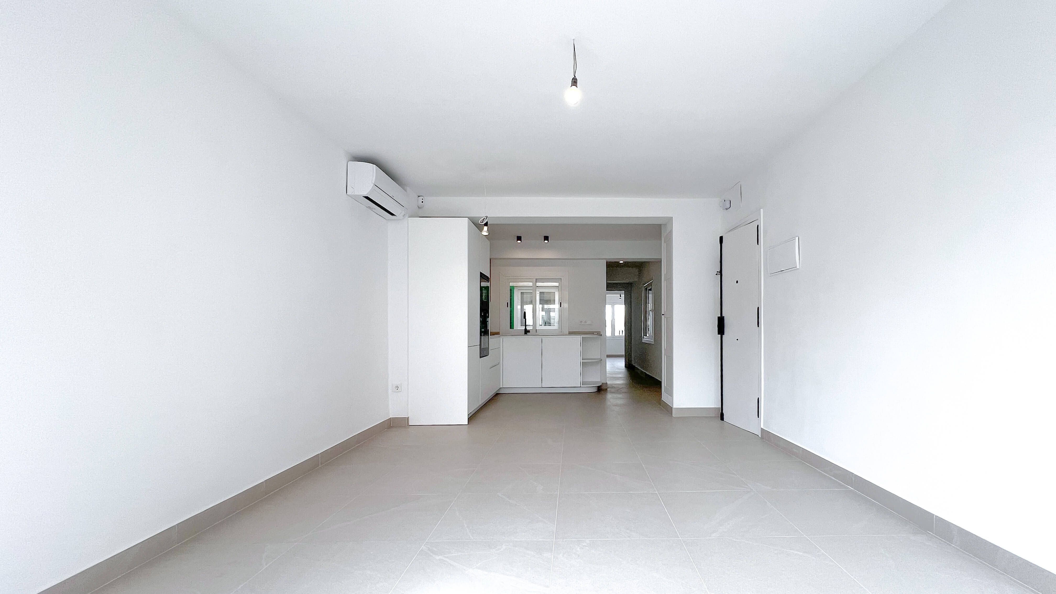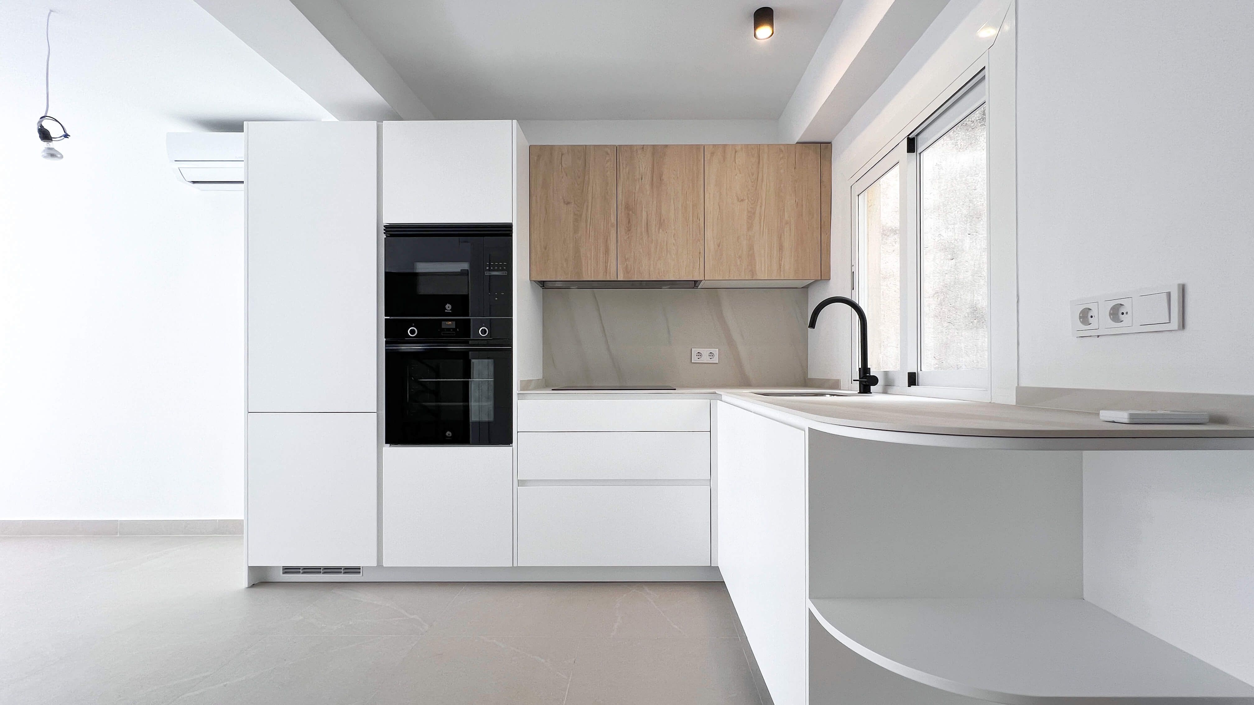 Este apartamento recién renovado, de estilo moderno, se encuentra en el barrio de Palma "El Camp d'en Serralta". La propiedad, que fue construida originalmente en 1974, tiene una superficie habitable de aproximadamente 66 m² y es muy luminosa gracias a las grandes ventanas. Cuenta con dos dormitorios y un baño moderno con ducha (y ventana). En todas las habitaciones se han instalado nuevos aparatos de aire acondicionado (frío/calor) que garantizan una temperatura agradable durante todo el año. En el espacioso salón también se encuentra la moderna y de alta calidad cocina de marca (de Manacor), que está equipada con todos los electrodomésticos comunes. Se pueden ver manillas y grifos negros en todas las puertas y en el baño, que aportan toques decorativos y combinan bien con los azulejos. Durante las obras de renovación, se renovaron por completo las instalaciones eléctricas y de agua, así como las ventanas y puertas de doble acristalamiento. El apartamento está en el segundo piso de un pequeño edificio multifamiliar y no dispone de ascensor ni de plaza de aparcamiento. Además, hay una terraza comunitaria donde también se tiene un pequeño trastero, en el cual está instalada la lavadora y aún queda espacio para sus utensilios personales. Los gastos comunitarios ascienden a 45 euros mensuales y se pagan trimestralmente. Si se ve como el nuevo propietario y tiene un gran interés en la propiedad, no dude en contactarnos. ¡Esperamos su llamada!