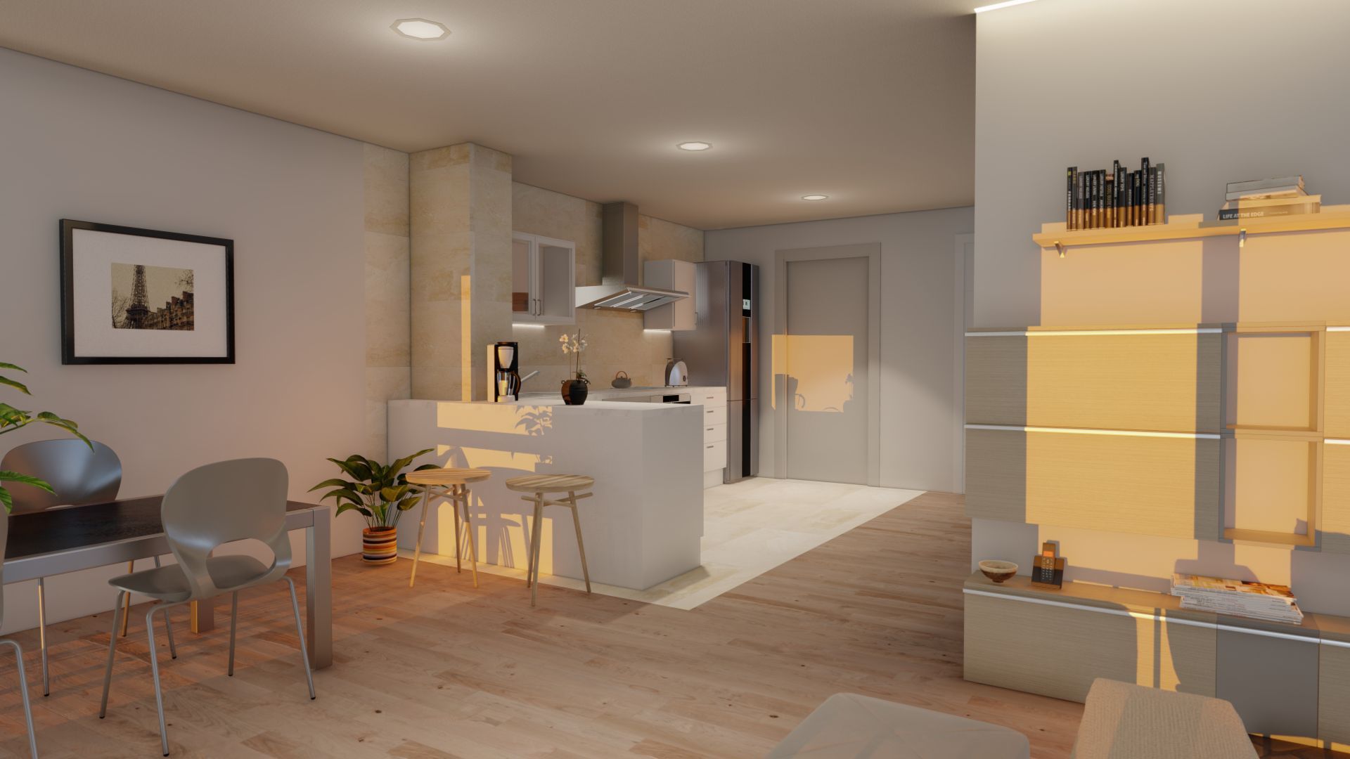 Terrazas: Con pavimento de gres porcelánico resistente y sistemas de iluminación LED que crean un ambiente acogedor.