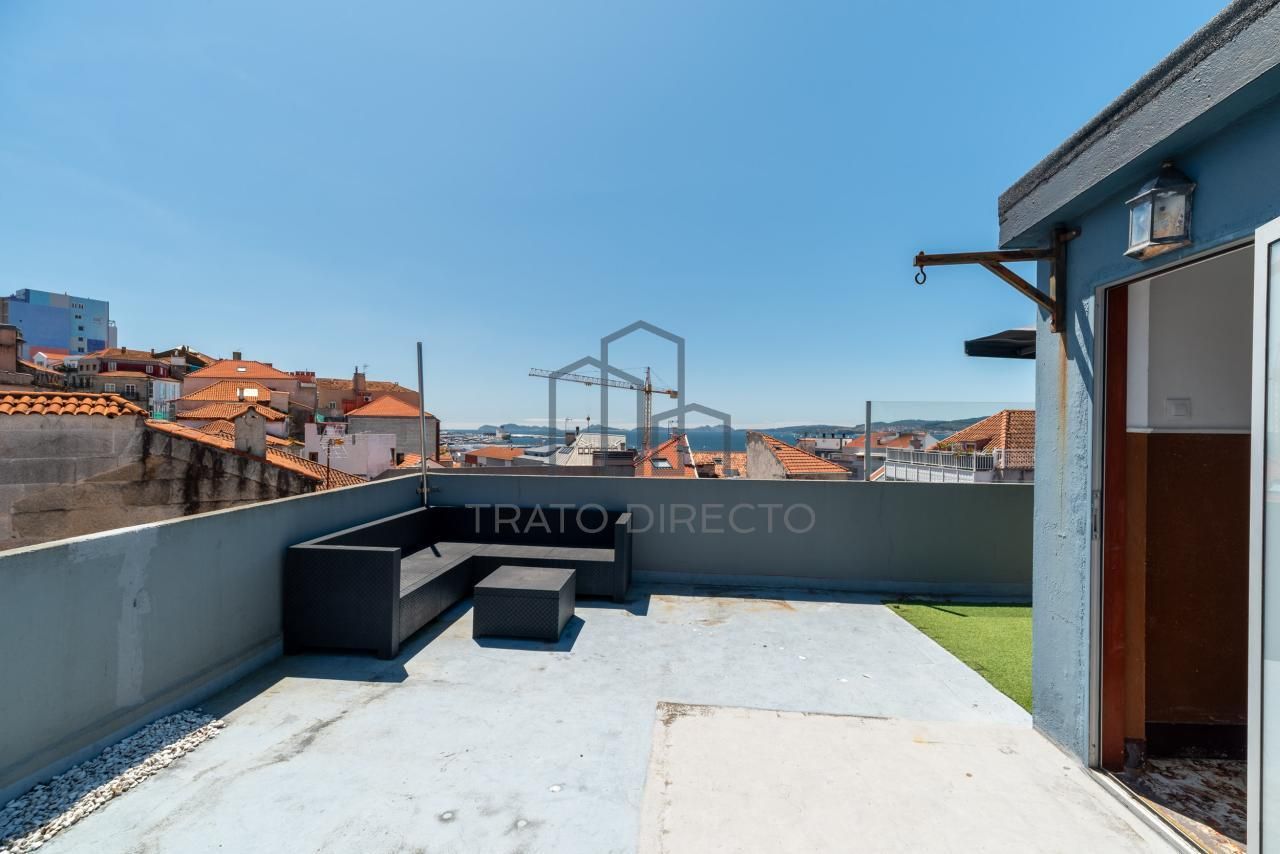 Se trata de una vivienda reformada en el año 2015, con un total de 72m2 de planta, y que cuenta con la gran particularidad de gozar de una espectacular terraza privada de 55m2 en la cubierta del edificio. A dicha terraza, su acceso se puede dar desde el interior de la vivienda a través de una escaleras de caracol, o también desde la puerta de acceso a la azotea que existe en el cañón de escalera comunitario. Por donde acceder será una mera cuestión de gustos, si bien lo más relevante será su disfrute. Hablamos de una terraza 'sin fronteras' con bonitas vistas de la Ría de Vigo, sus Islas Cíes pero también de aquellos elementos que identifican a nuestra ciudad como el Hotel Bahía y las torres de la colegiata. Se trata de un lugar idílico por su puesta de sol y un espacio espectacular para noches de verano.